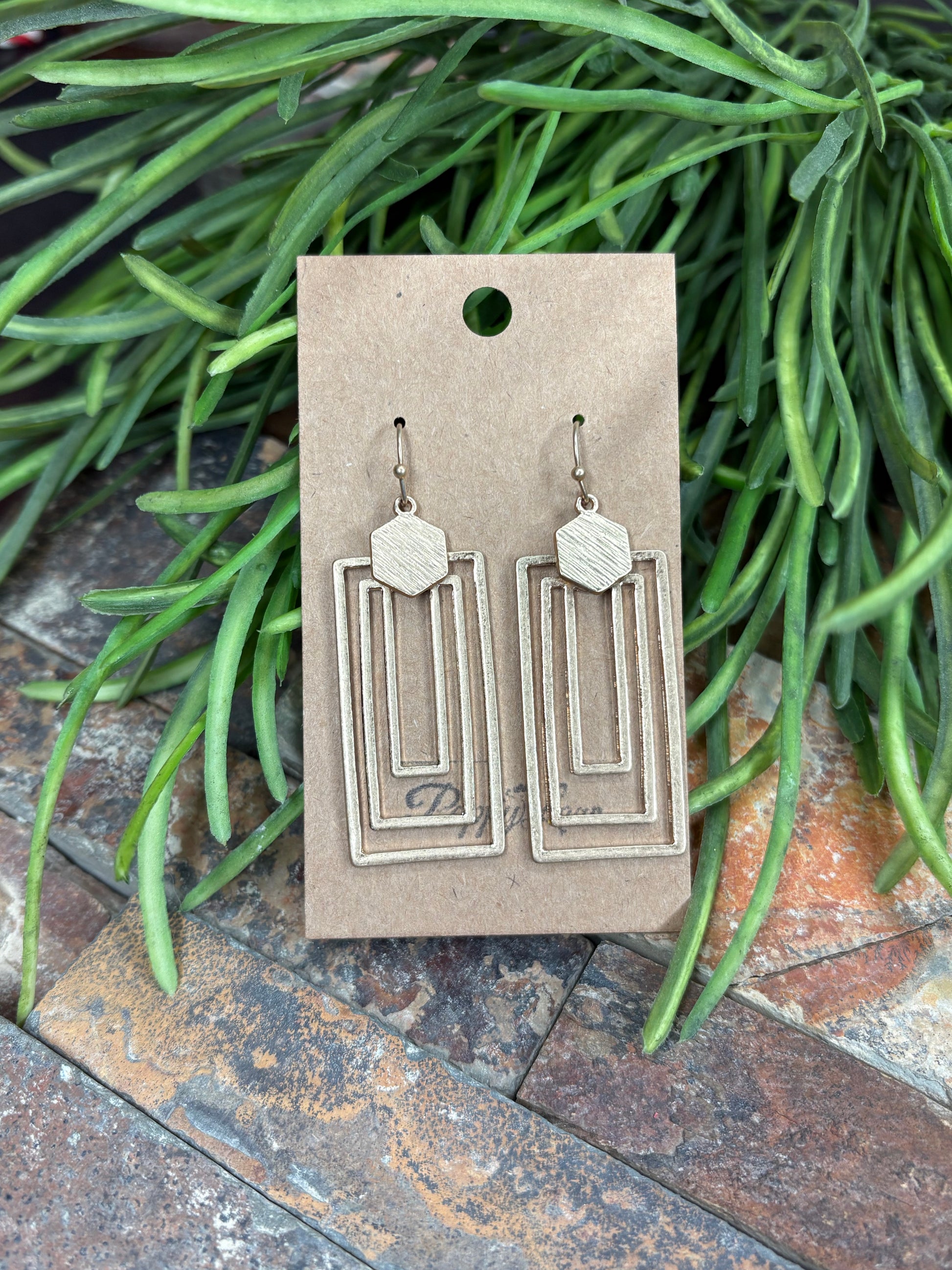 Add a playful twist to your look with these All the Buzz Earrings in matte gold. Featuring triple-layered rectangular hoops, they dangle with quirky charm and catch the eye with every movement. Perfect for adding fun and flair to any outfit!