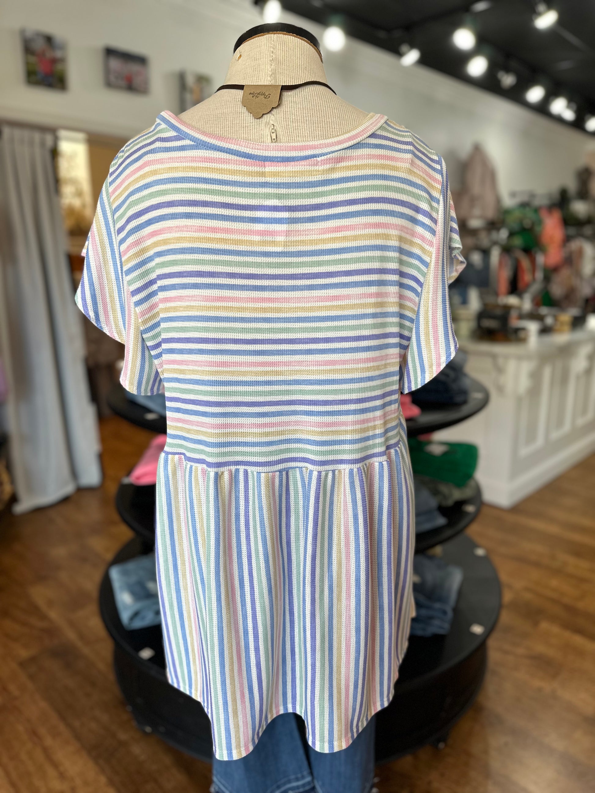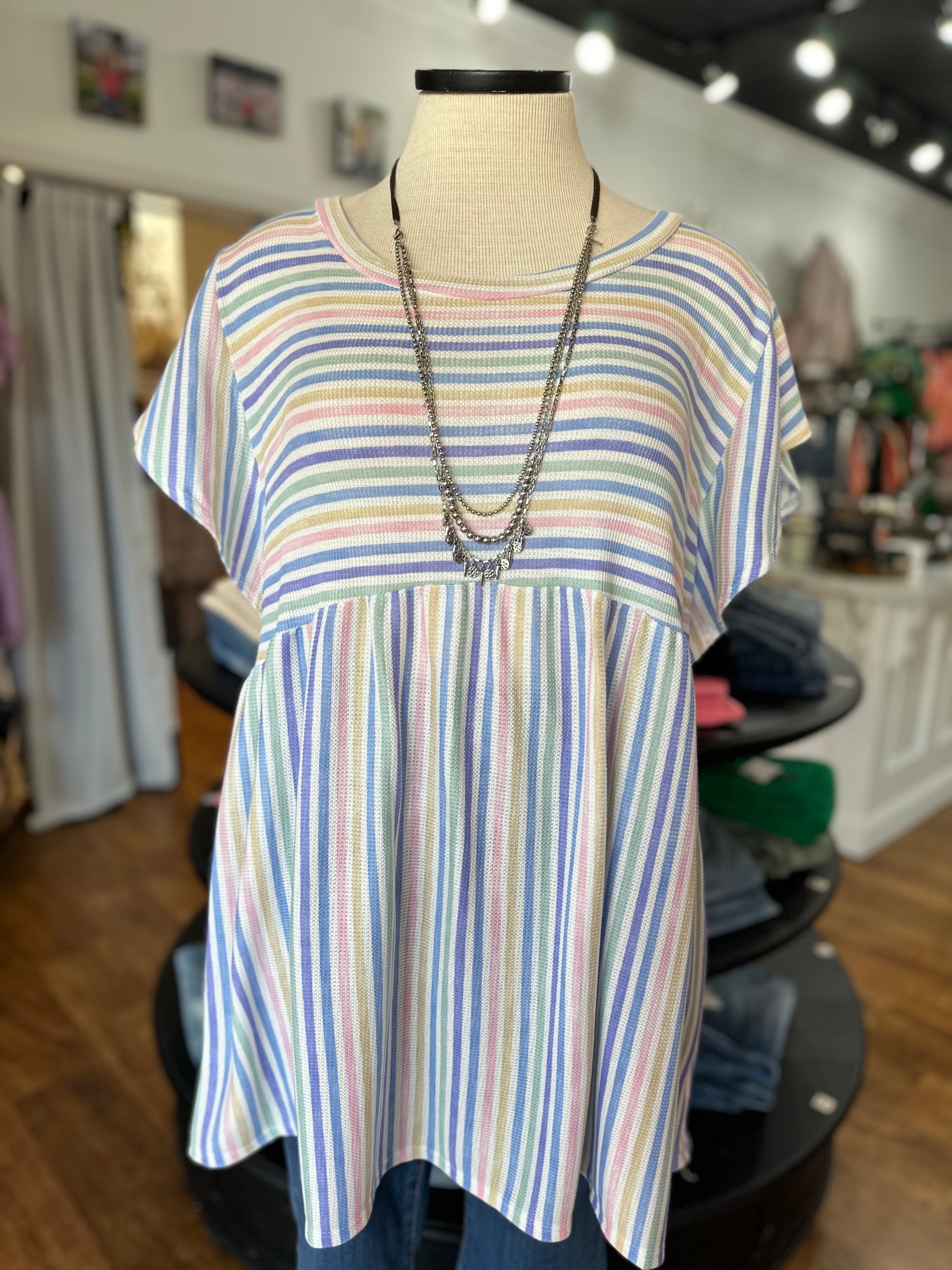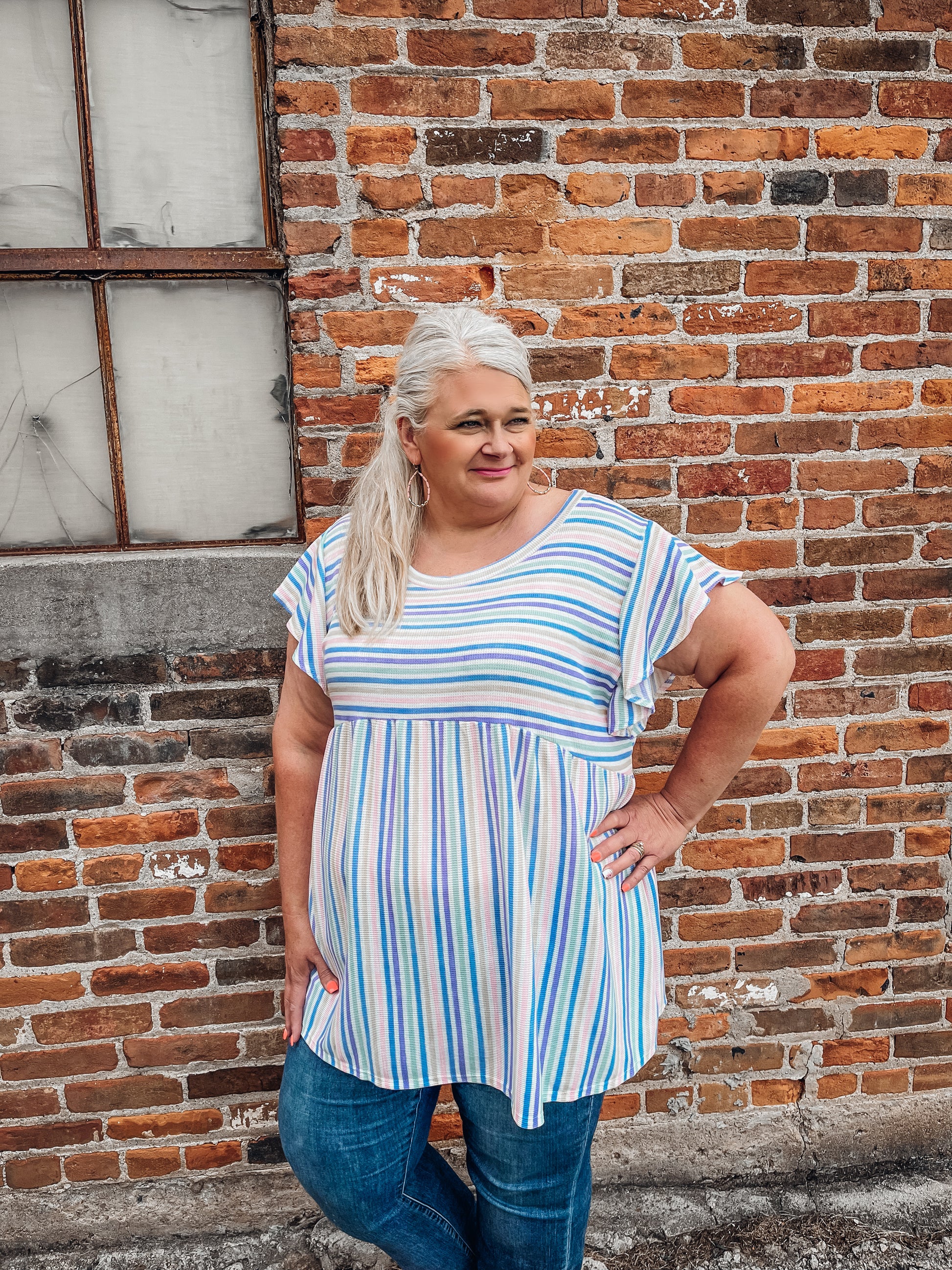 This striped top is the definition of classic and cute! Those colors are spot on for the season and we love that babydoll style. This top is going to look great with white skinnies and sandals or wedges for a very put together casual cute look. Features a multi colored striped pattern, round neckline, short ruffle sleeves, babydoll fit and a comfy relaxed fit.