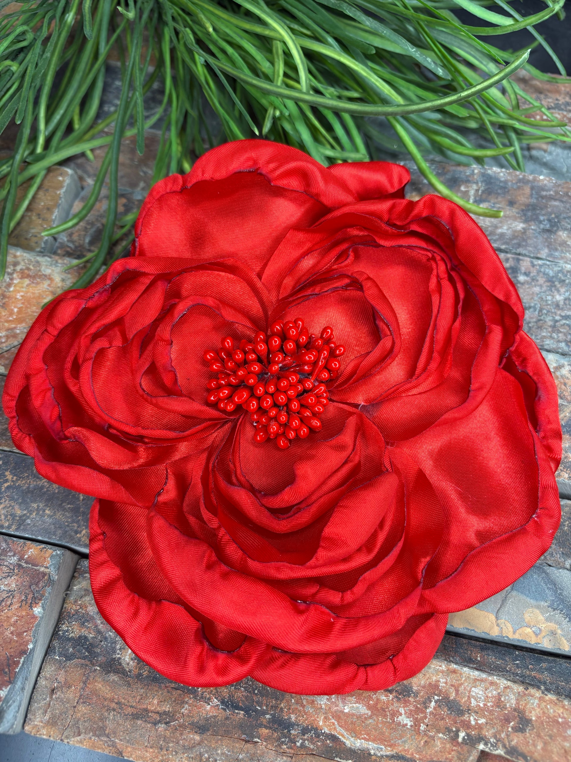 Add a pop of charm with this handcut satin flower pin! Perfectly playful in vibrant red, it’s your go-to accessory to brighten jackets, cardigans, dresses, or kimonos. Tie it on boots or even jazz up a pillow at home—because why not? Wear it as a necklace or pin it wherever you want to bloom and shine. Your style, your rules!