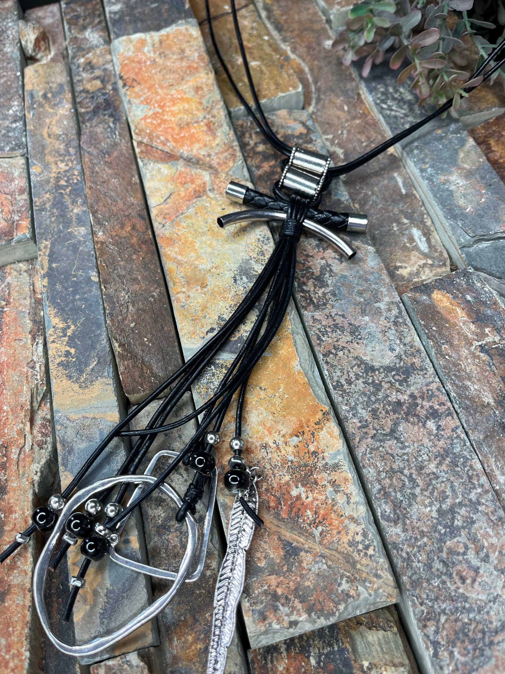 Experience effortless bohemian style with our Boho Flow Multi Charm Necklace. Featuring black and silver beaded accents and a black corded necklace, this multi charm necklace is the perfect complement to any outfit. The perfect blend of edgy and chic, it's a must-have accessory for the free-spirited fashionista.