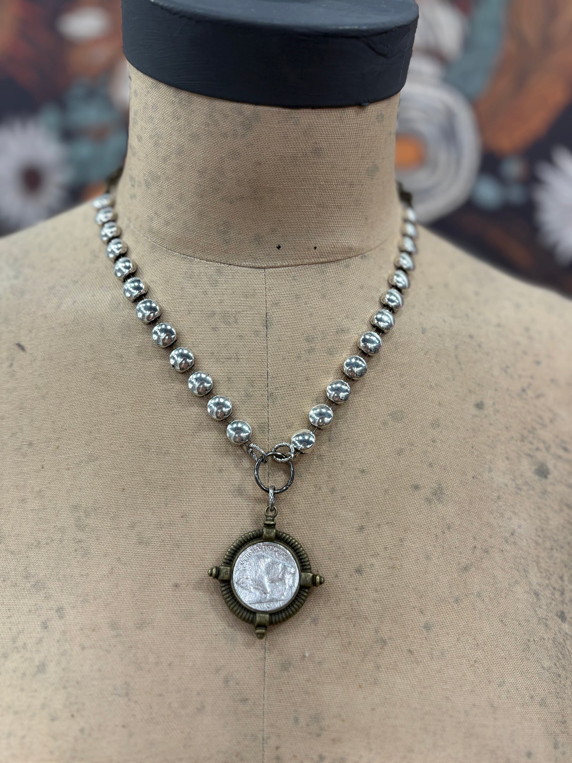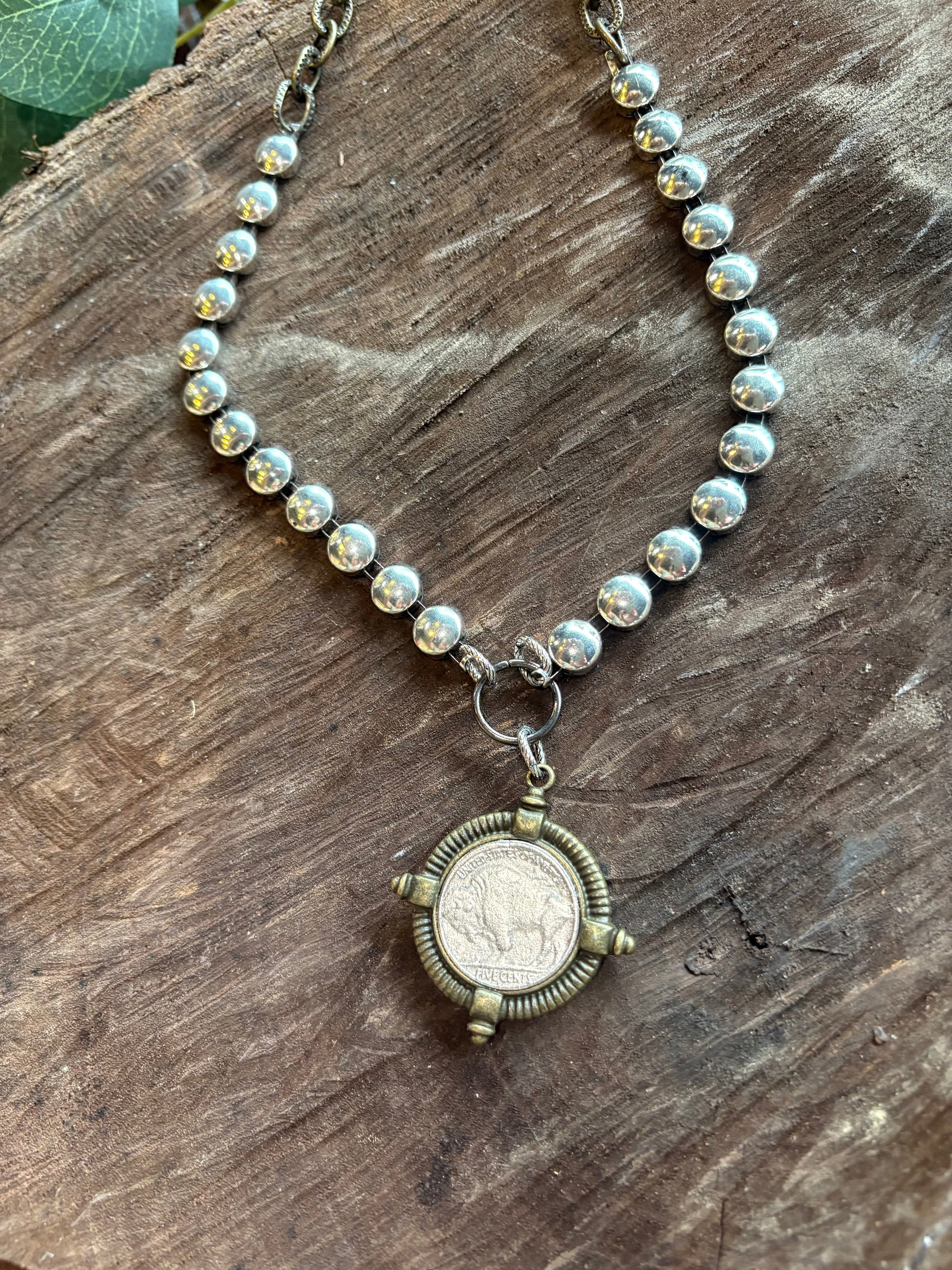 Add a touch of vintage charm to your look with this playful Buffalo Coin Charm Medallion Necklace. Featuring a mixed metal chain and a buffalo nickel-style coin encased in warm brass, it brings bohemian vibes and timeless style together effortlessly. Perfect for layering or wearing solo, this necklace adds a unique, nostalgic flair to any outfit.
