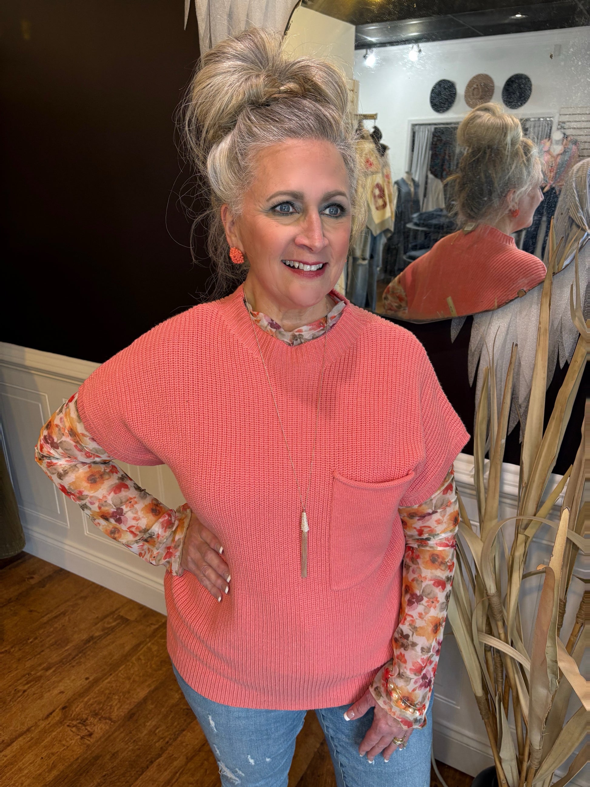Sweet and chic, this adorable sweater is the perfect piece for transitioning into spring! Features an unlined knit material with a ribbed texture, a mock neckline, short sleeves, a single chest pocket with rolled detail, and a relaxed silhouette that ends in a straight hemline. Wear alone or pair with one of our mesh tops!