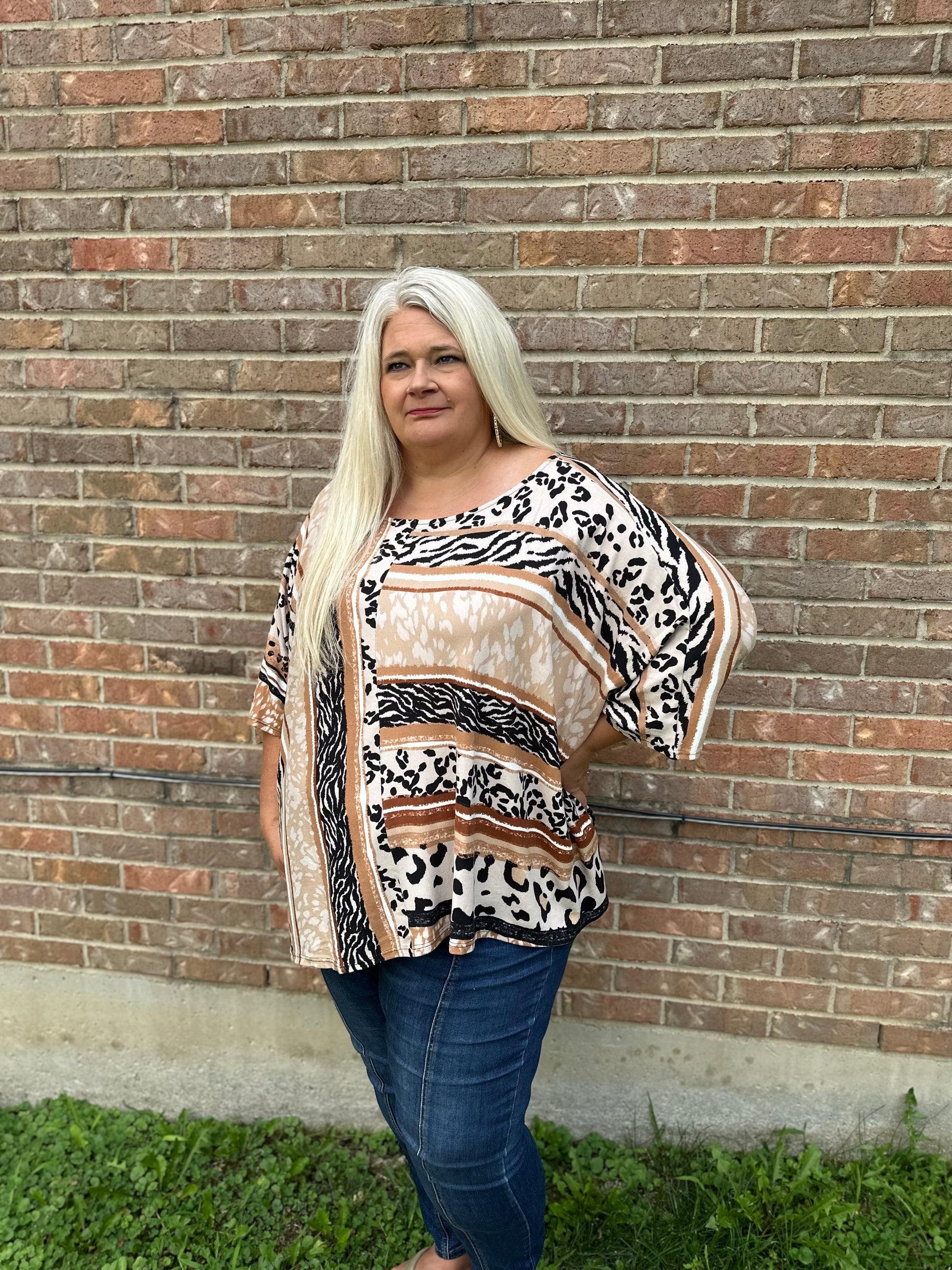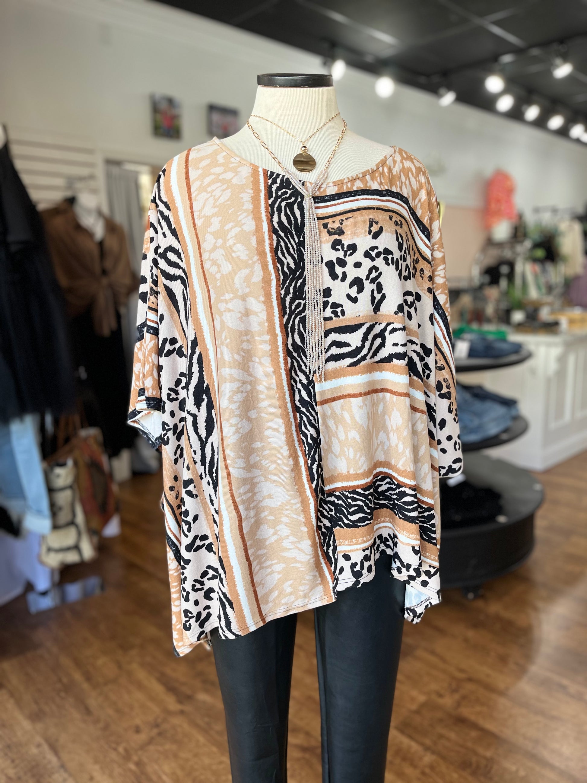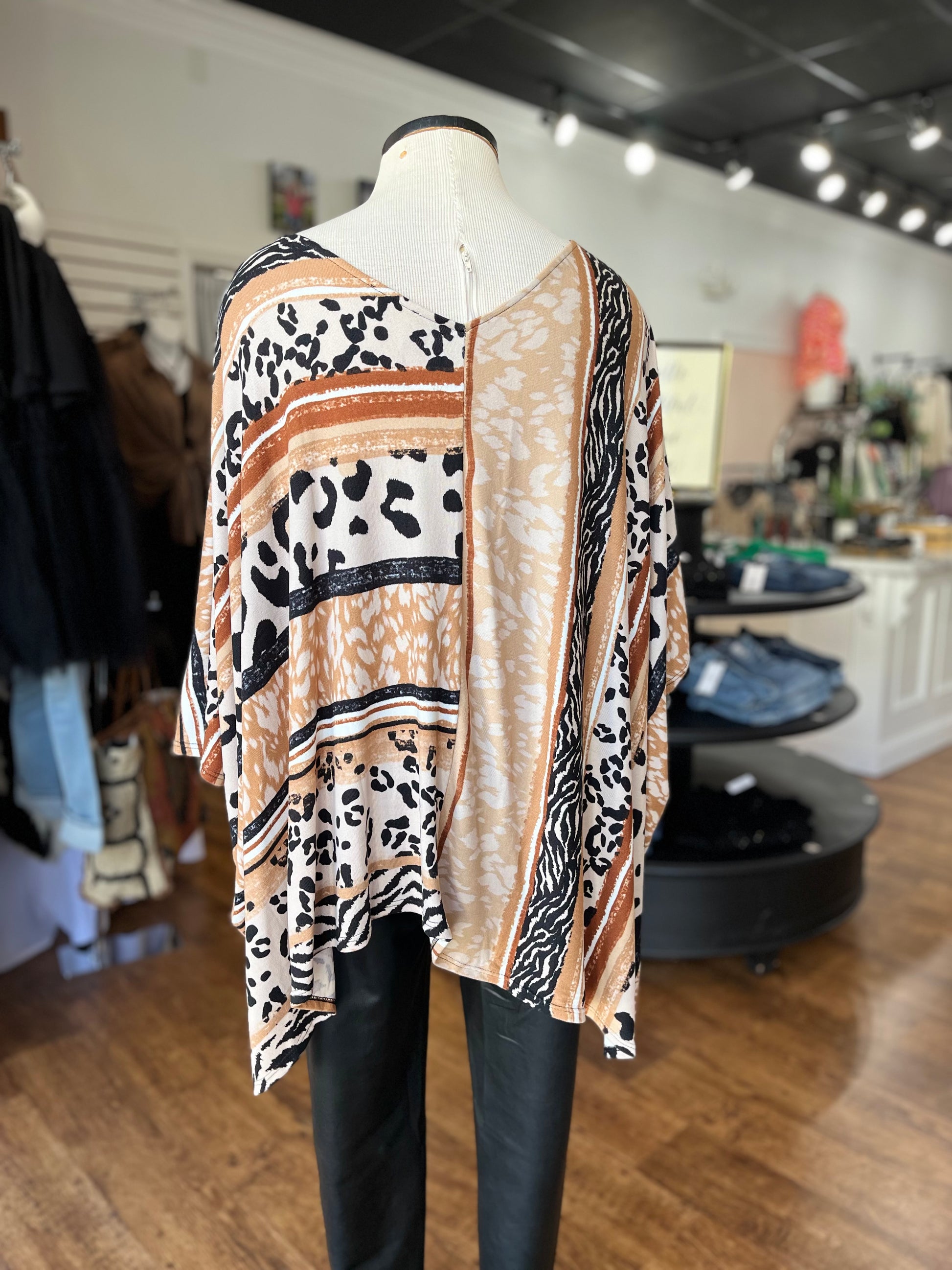 Introducing our Claim To Fame Kimono Sleeve Top, featuring an elegant animal print and oversized fit. Perfect for a charming date night, this top exudes confidence and style. Transform your outfit and make a statement with our must-have piece.