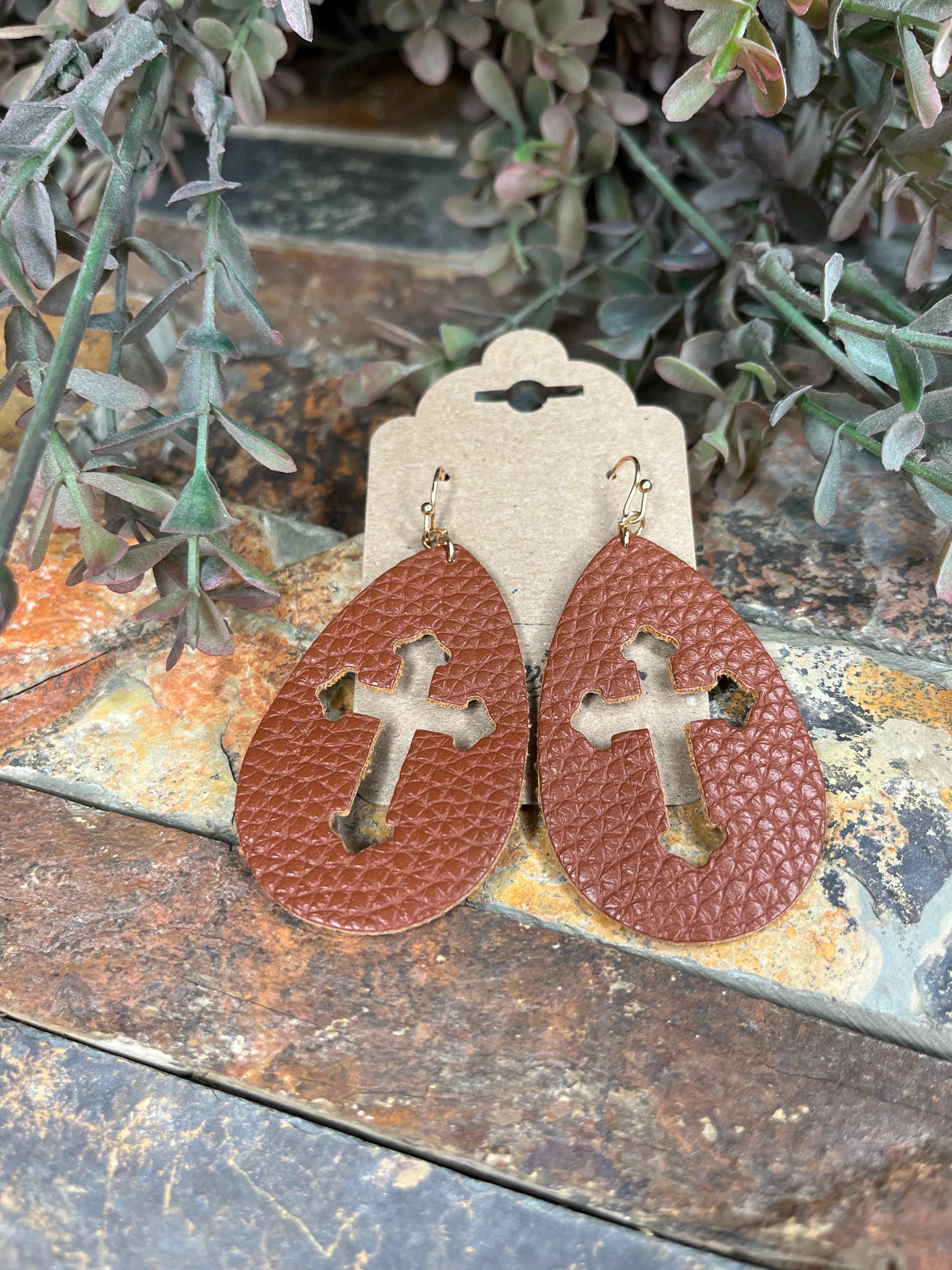 Expertly crafted with genuine leather, these Close To Me earrings feature a unique teardrop design with a cross cut out. The fish hook closure ensures a secure fit and comfortable wear. Add a touch of modern elegance to any outfit with these stylish earrings.