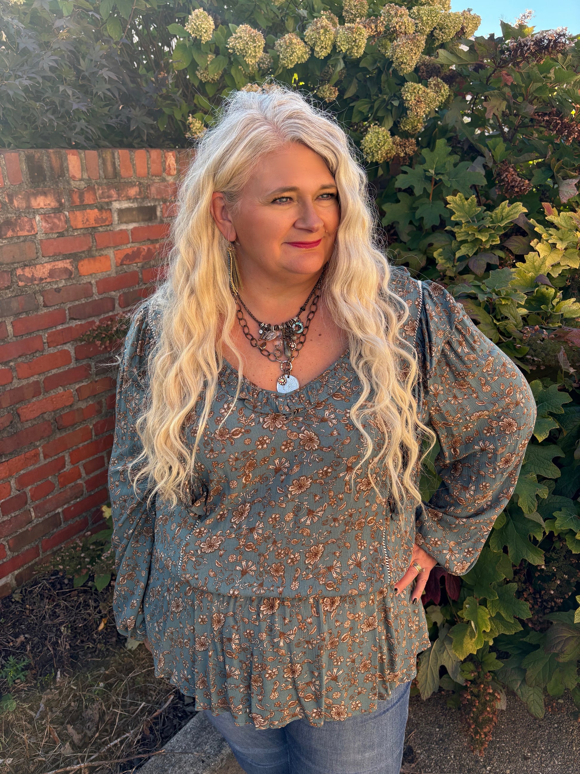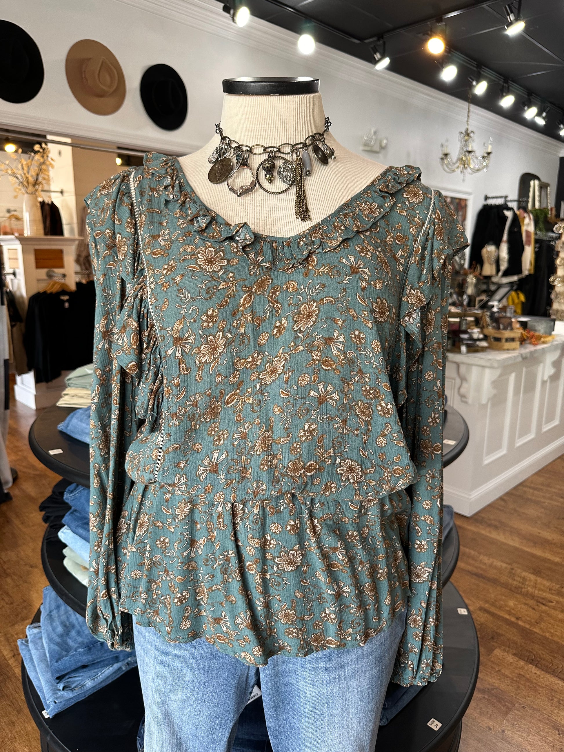 Flirt with fashion fate in our Date With Destiny Floral Top. This antique floral print v-neck top features long balloon sleeves and delicate cotton ladder trim. Ruffle details add a touch of whimsy, while the v-back with self tie adds a flirty finish. Perfect for a playful day out!