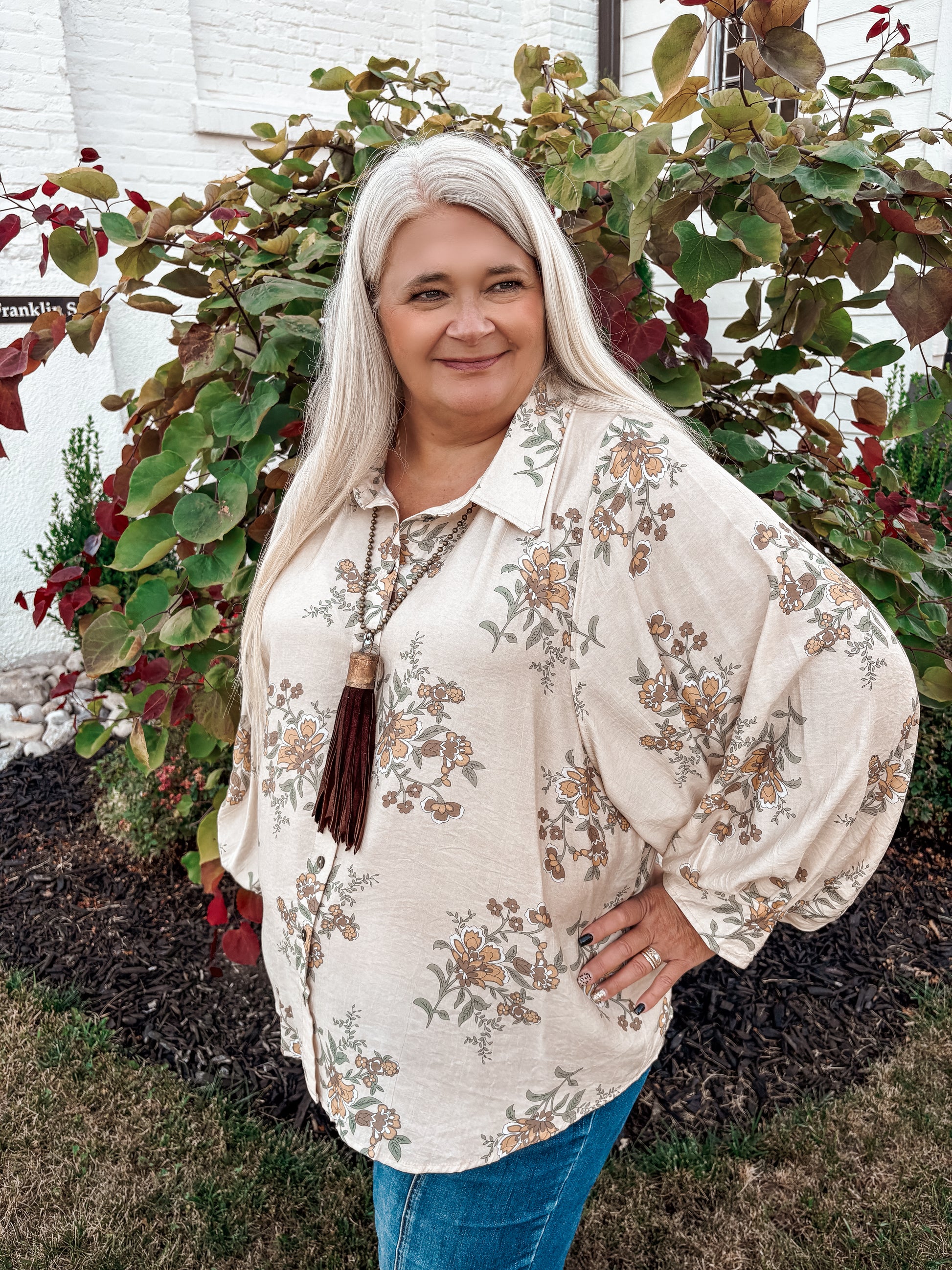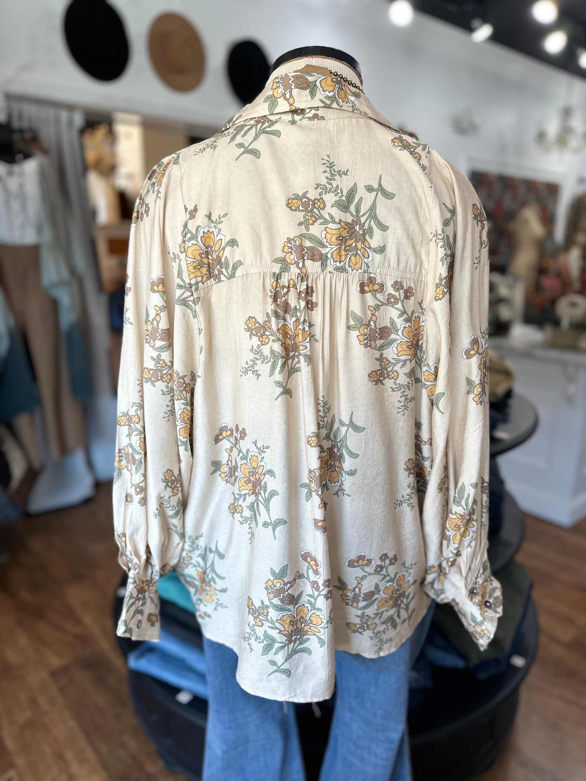 Embrace effortless charm with this floral print button-down top, designed for playful confidence. Featuring soft pleats at the shoulders and back yoke, it adds a gentle touch of texture and movement. Long sleeves with button cuffs and a classic collar complete the look, making it perfect for any day you want to bloom with style.