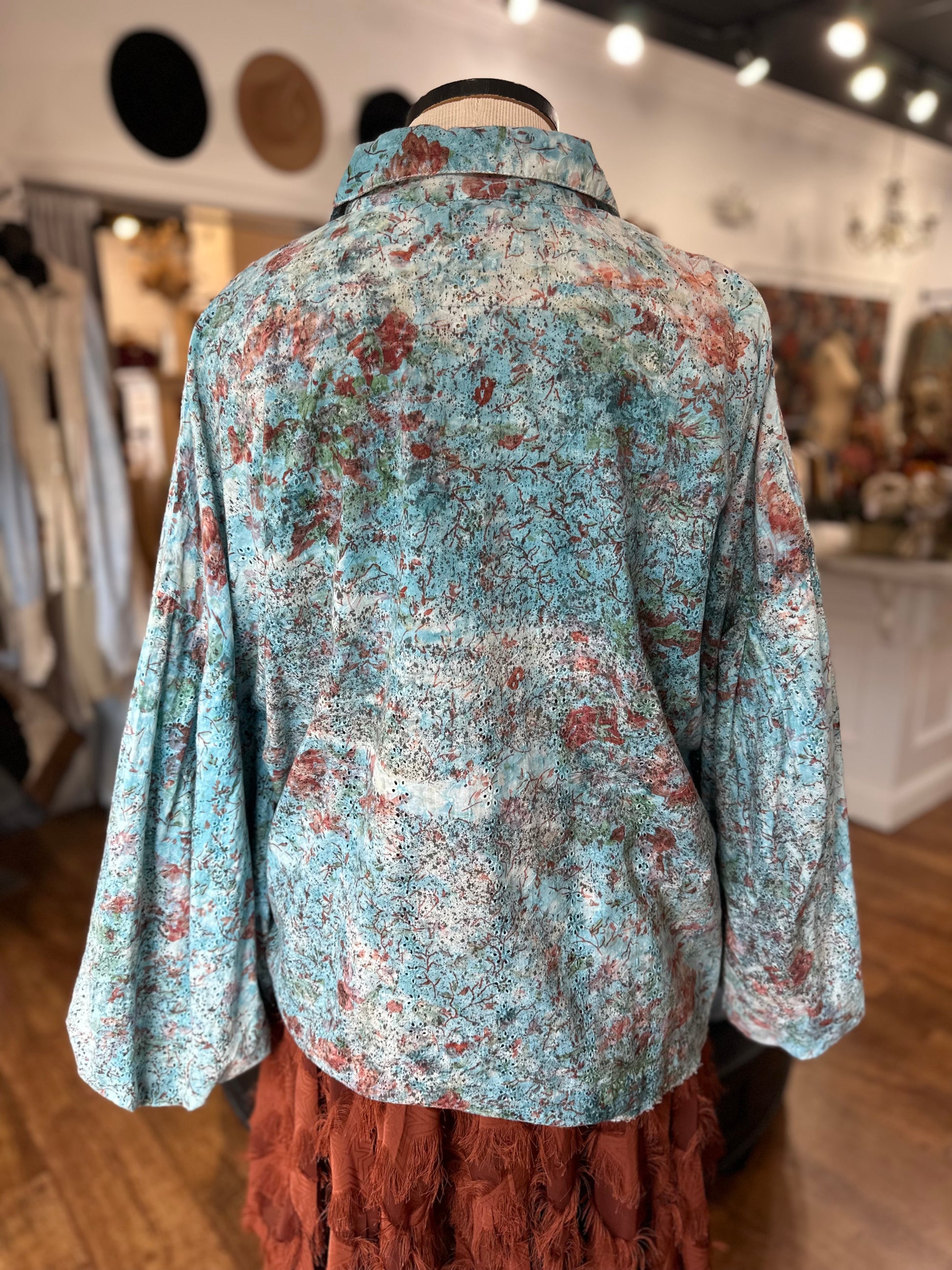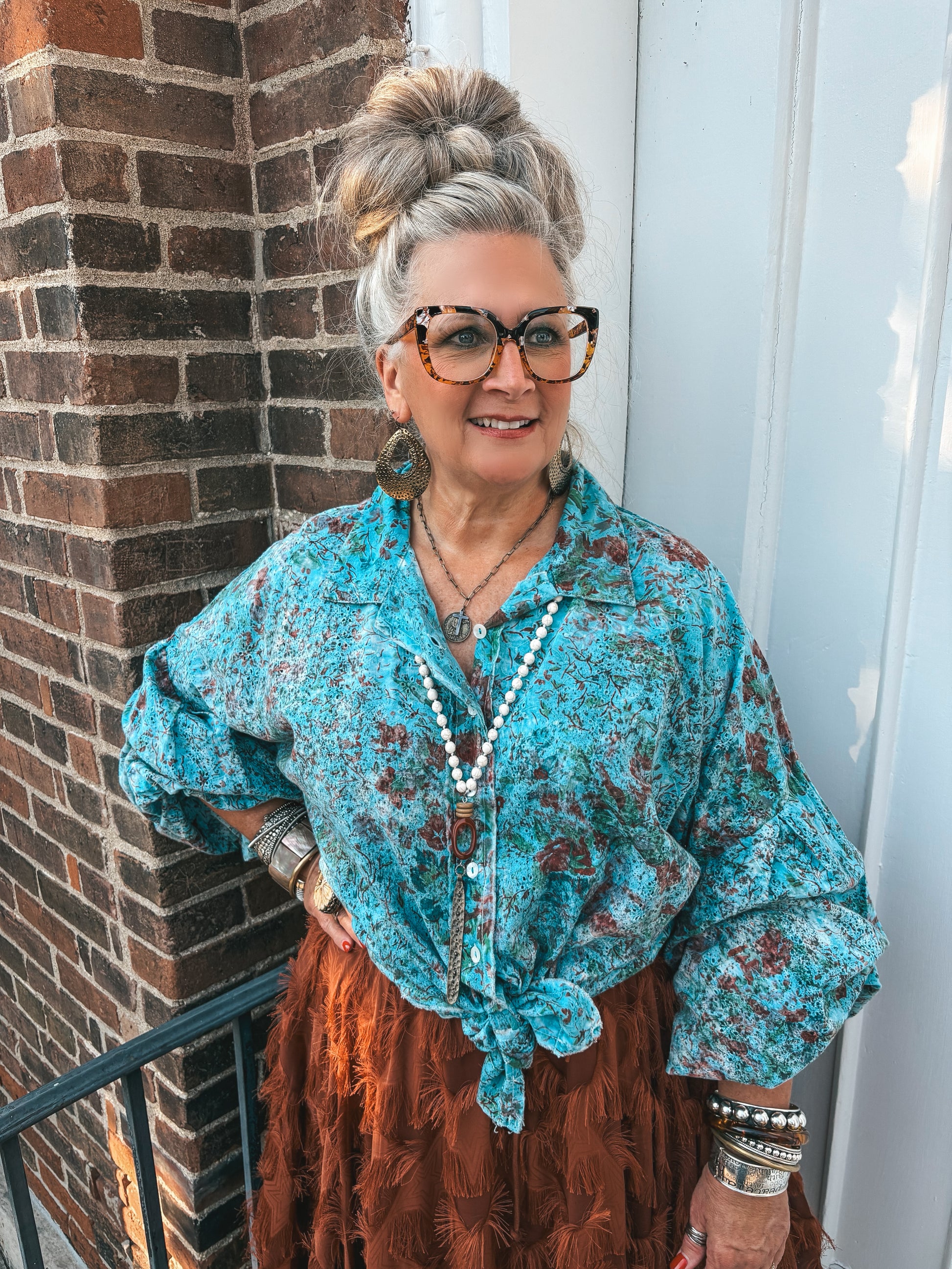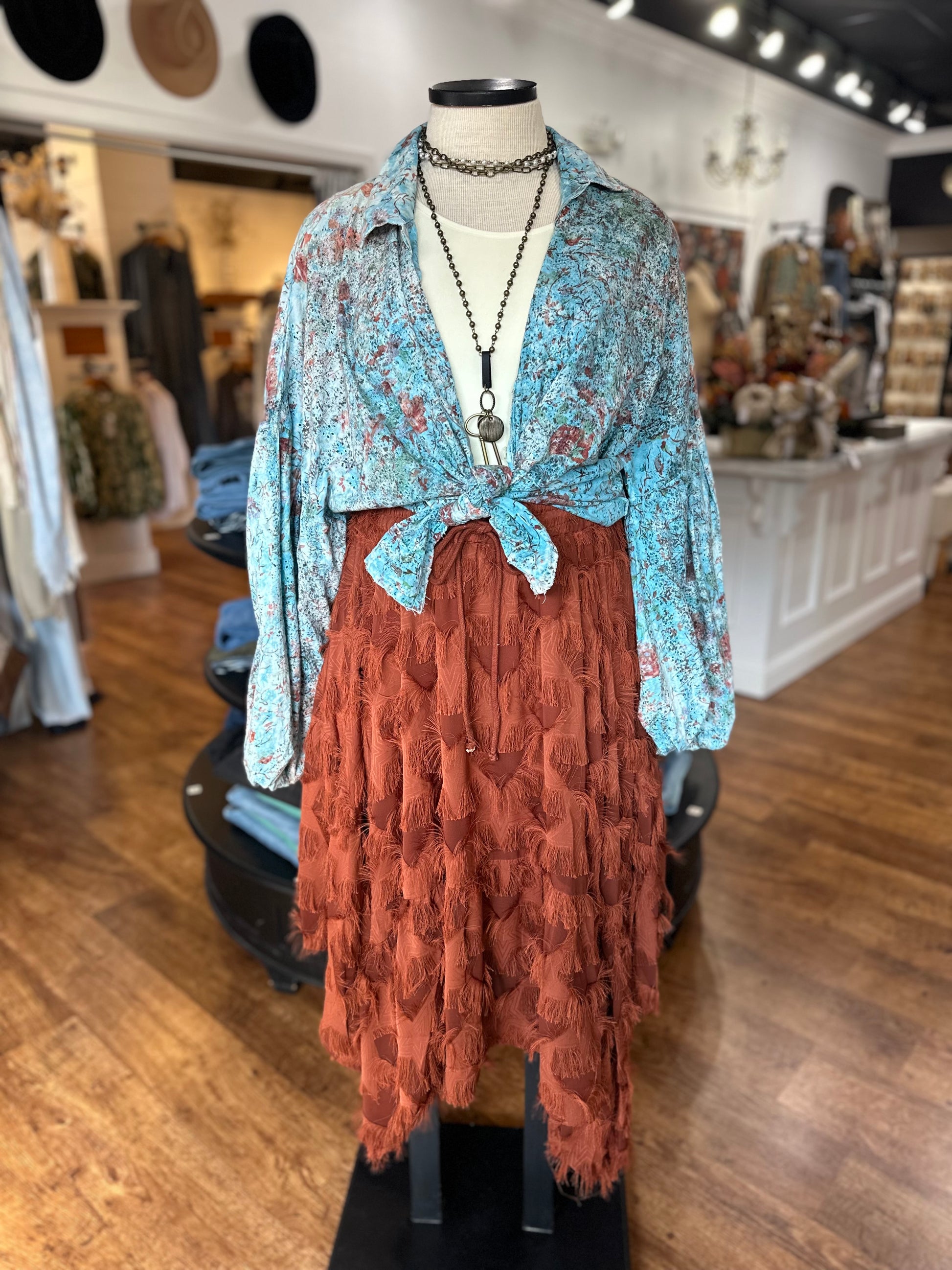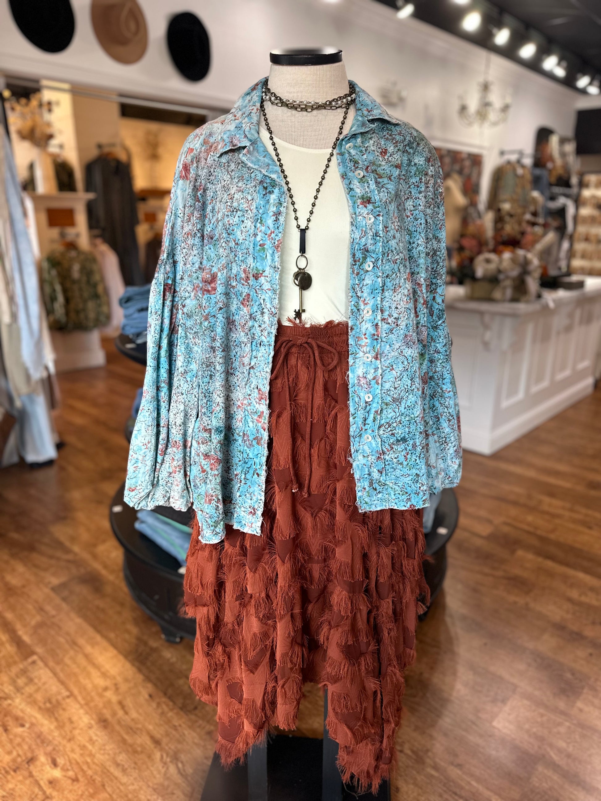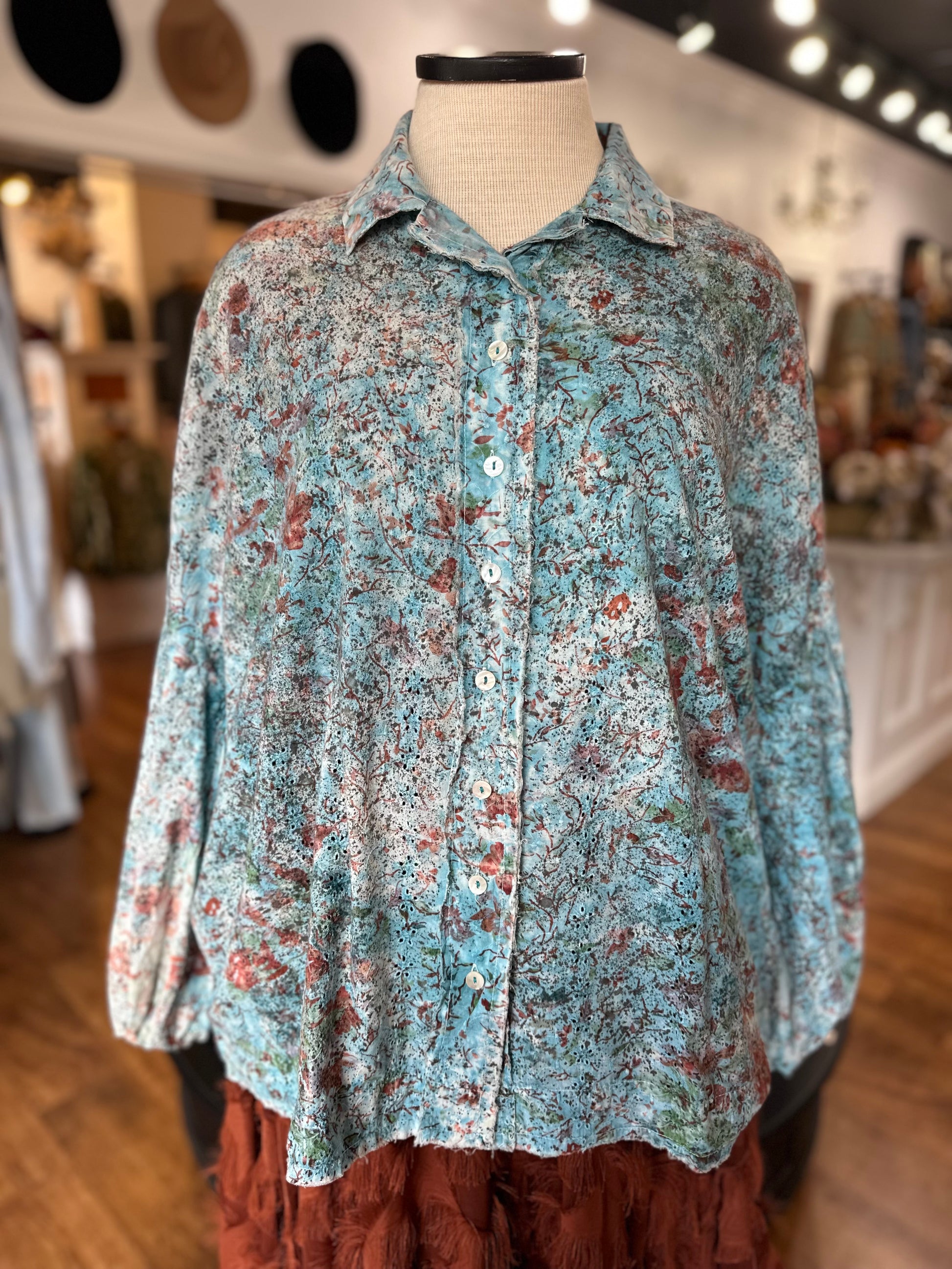 Brighten your wardrobe with this playful turquoise eyelet top, featuring charming puff sleeves and a breezy 3/4 length. The button-up design lets you wear it open for a relaxed vibe or tied at the bottom for a flirty twist. Distressed raw edges add an effortlessly cool finish to this versatile favorite.