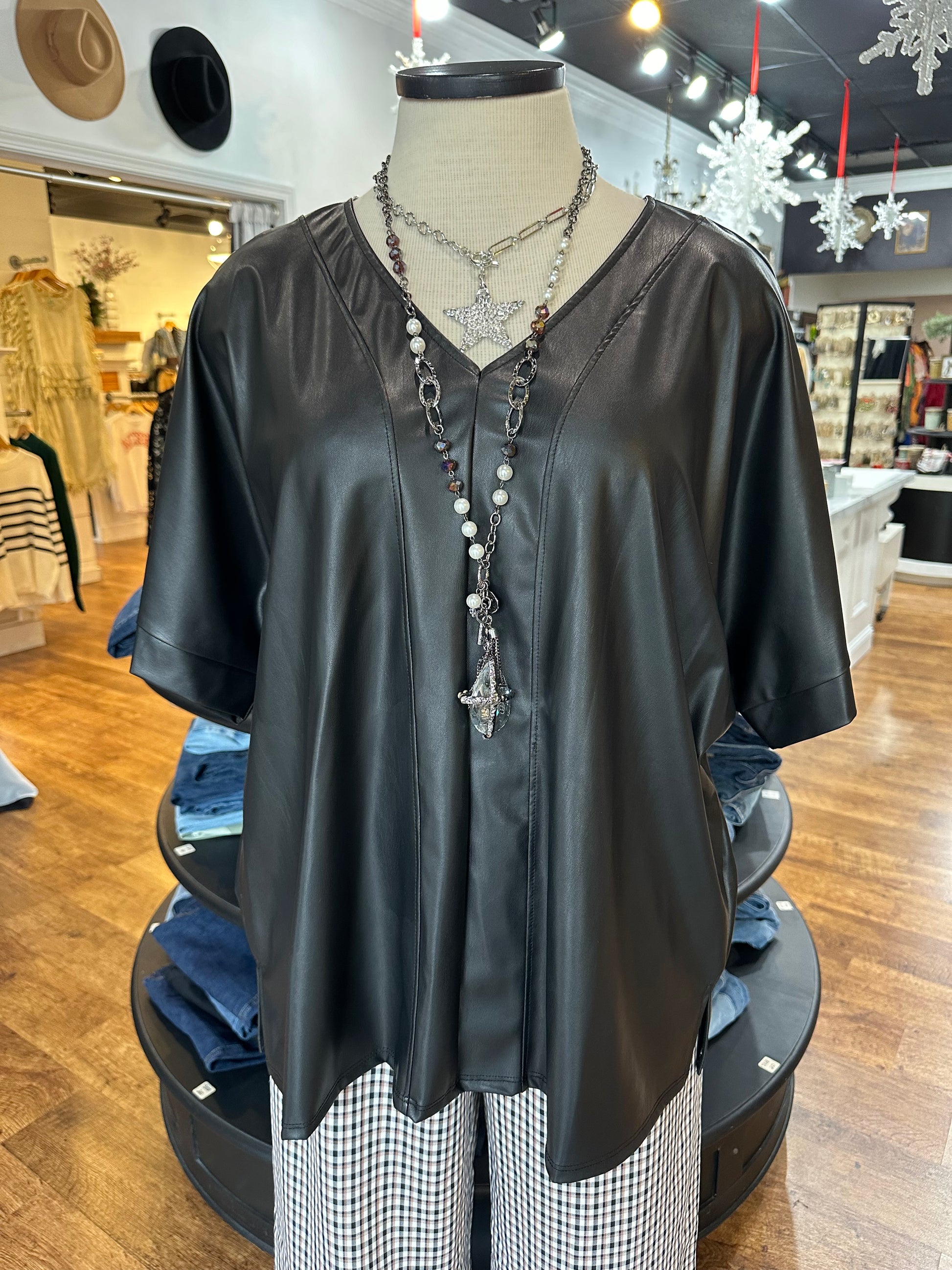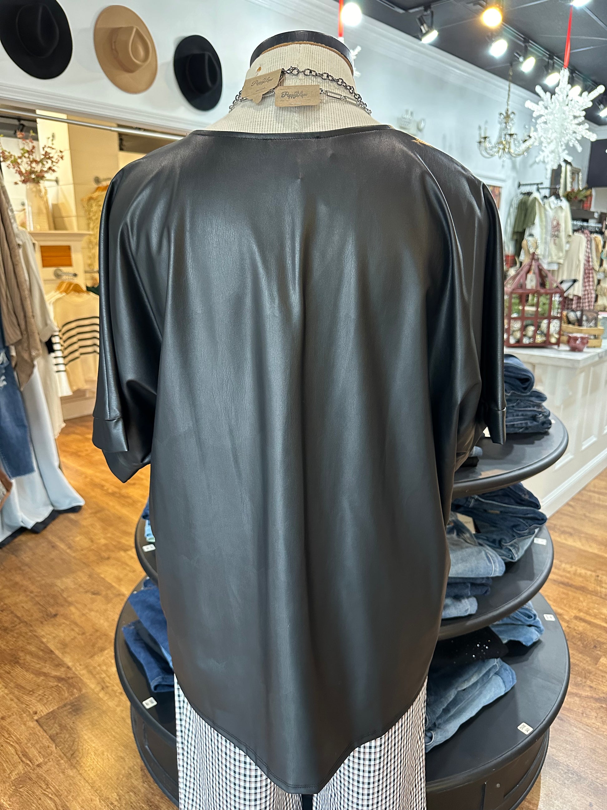 Embrace fate with this playful faux leather top! Featuring short sleeves, a v-neckline, and a high low hemline, this top is perfect for adding some edge to your wardrobe. The wide cuffs and neckline add unique details, making this top a must-have. (Don't leave your wardrobe's fate up to chance, add this leather top to your collection now!)