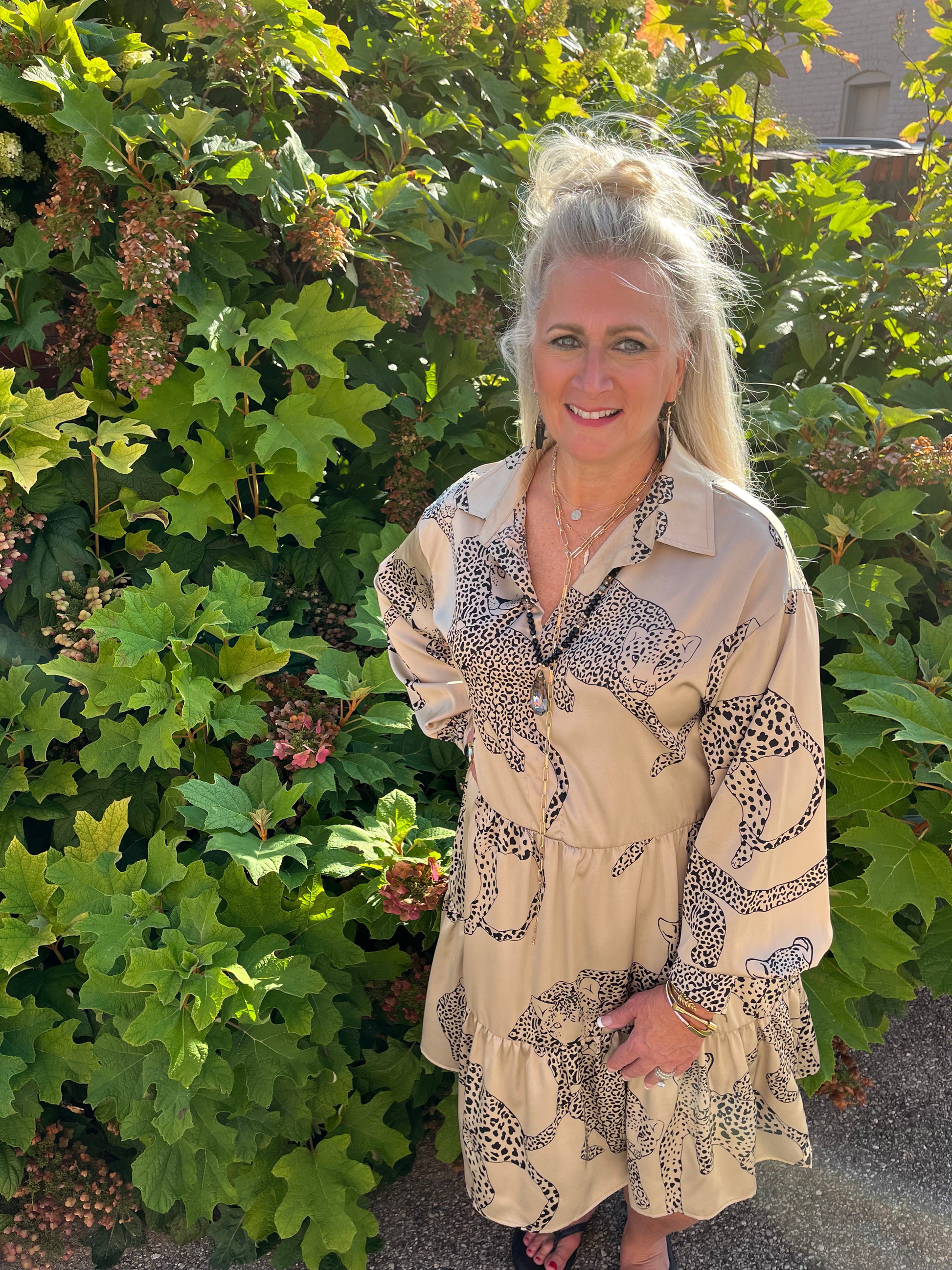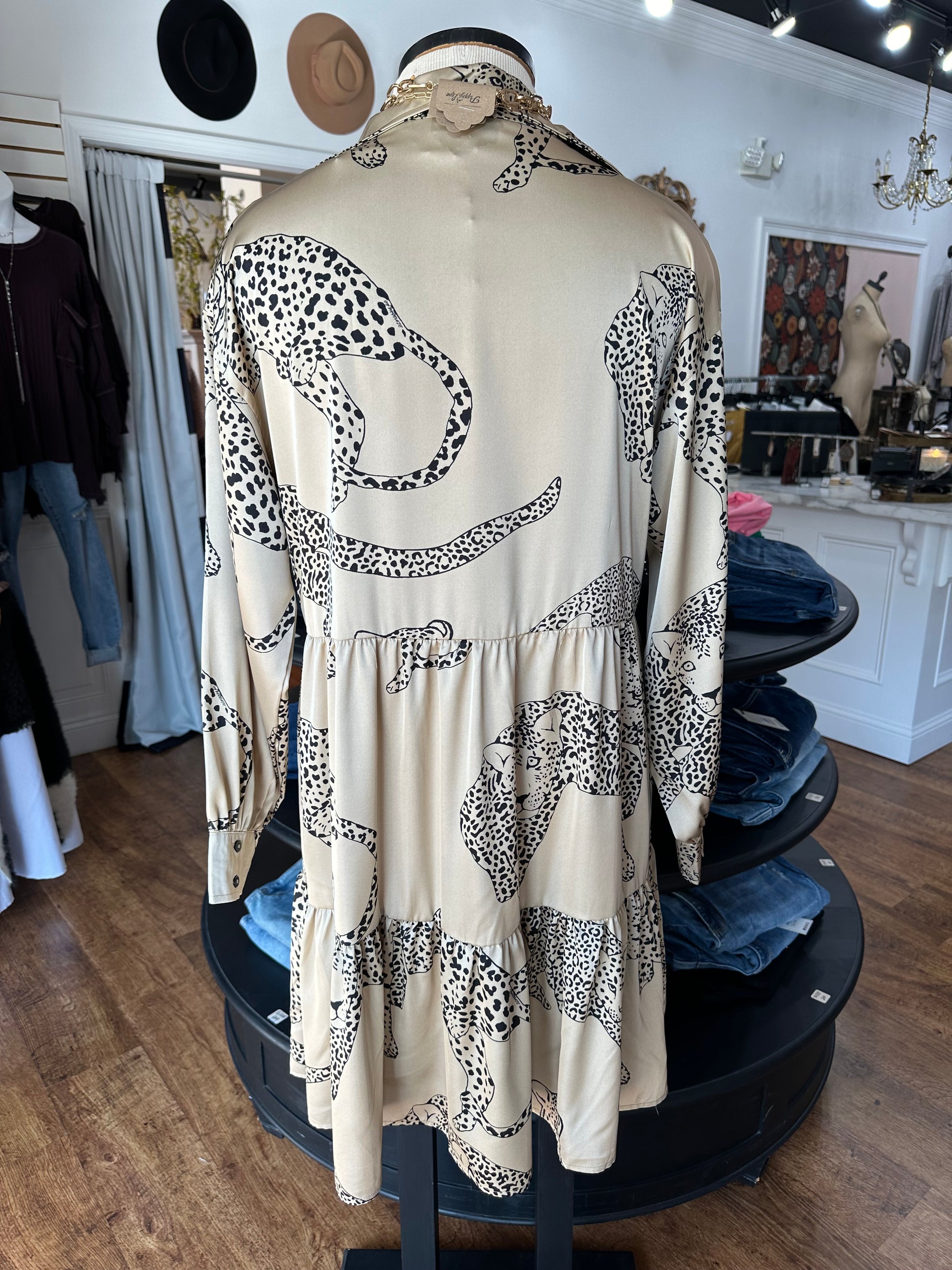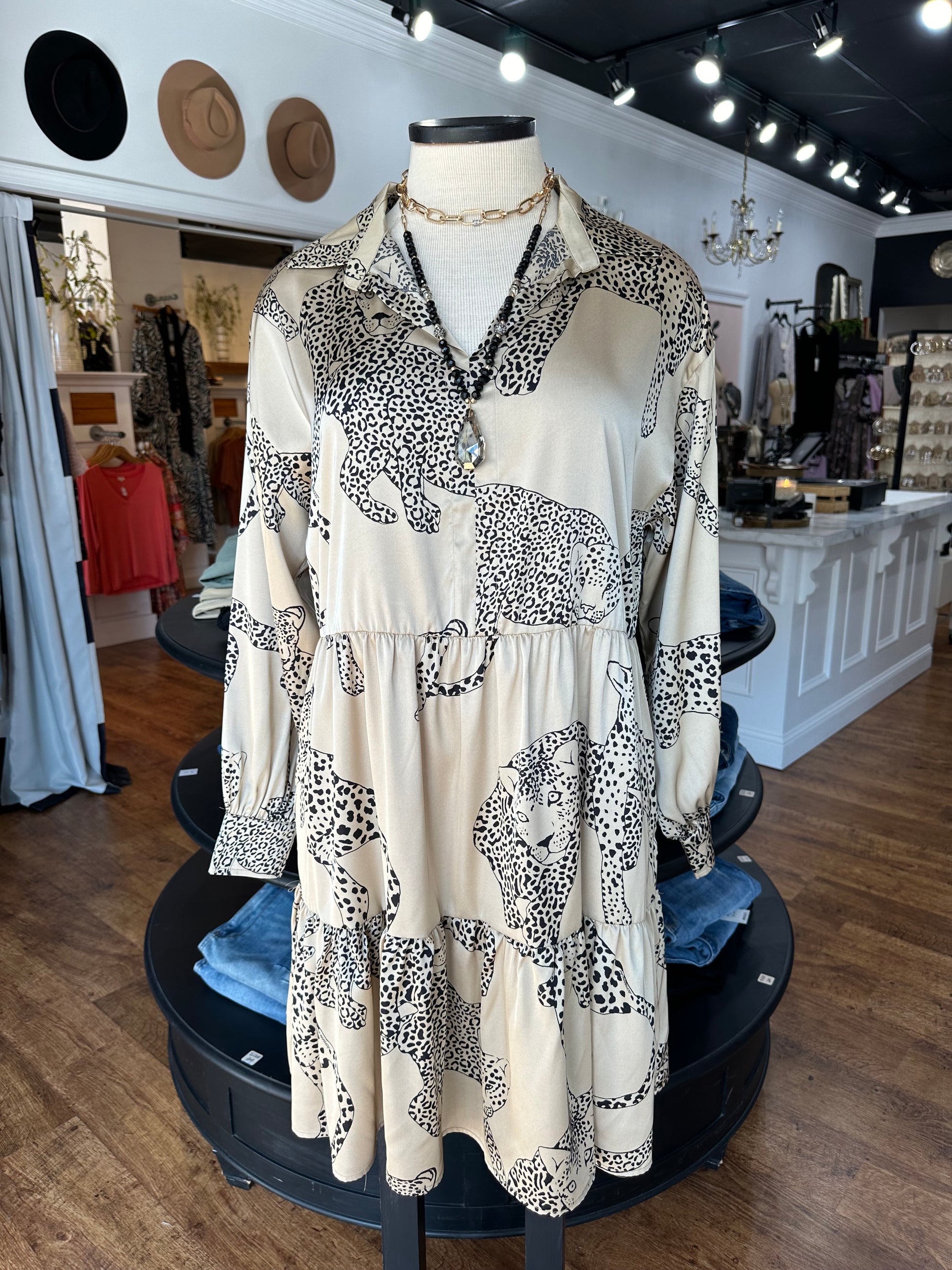 This cheetah printed dress will have you feeling fierce and sassy! That print, of course, has a lot to with that but it's also because of the flattering, flowy fit! This dress is so trendy right now so we are thrilled to be able to offer it to all of you! This dress features long sleeves, open v-neckline, tiered fit, fun cheetah print and satin material. Pair with this knee boots or your favorite booties!