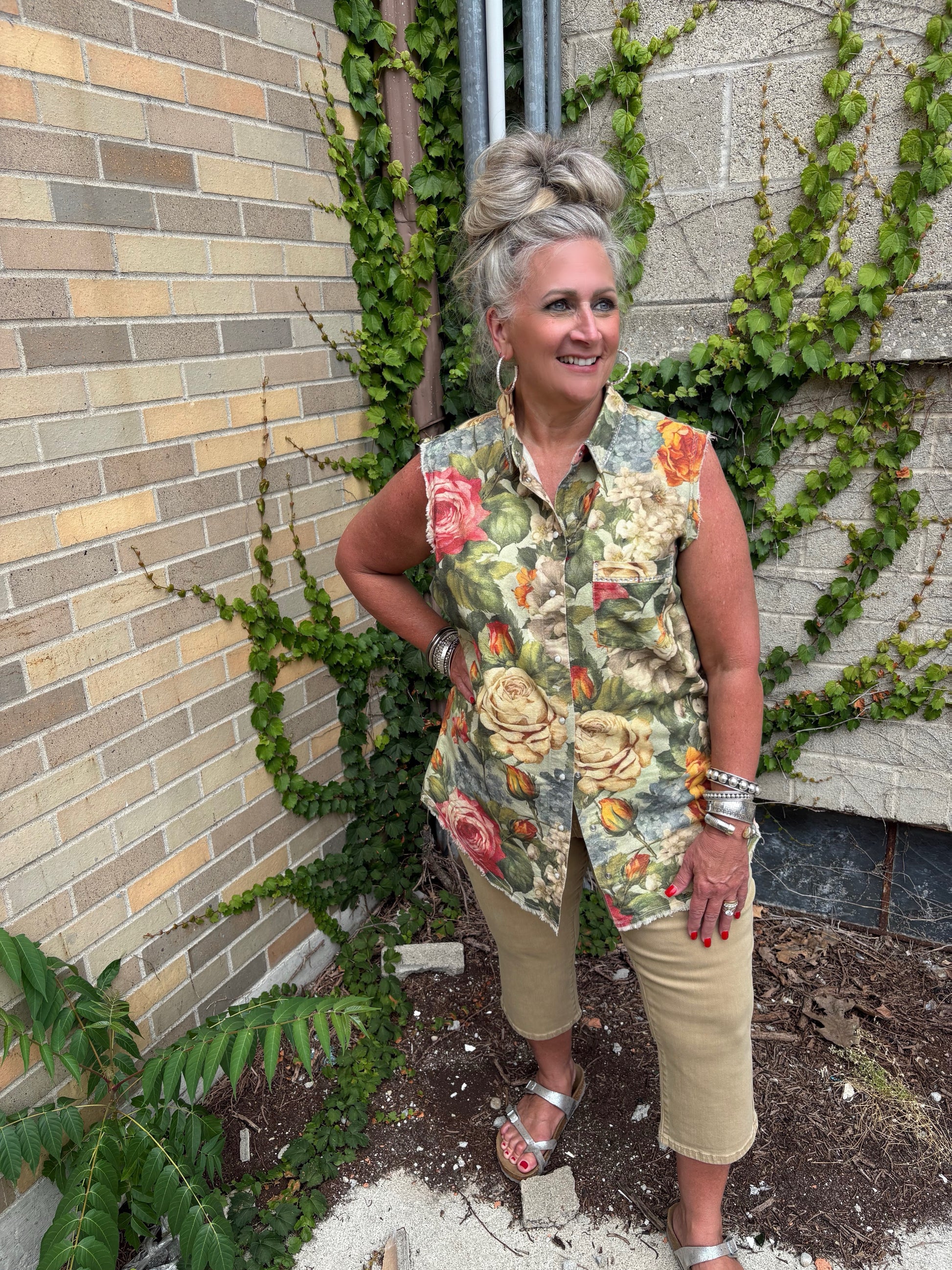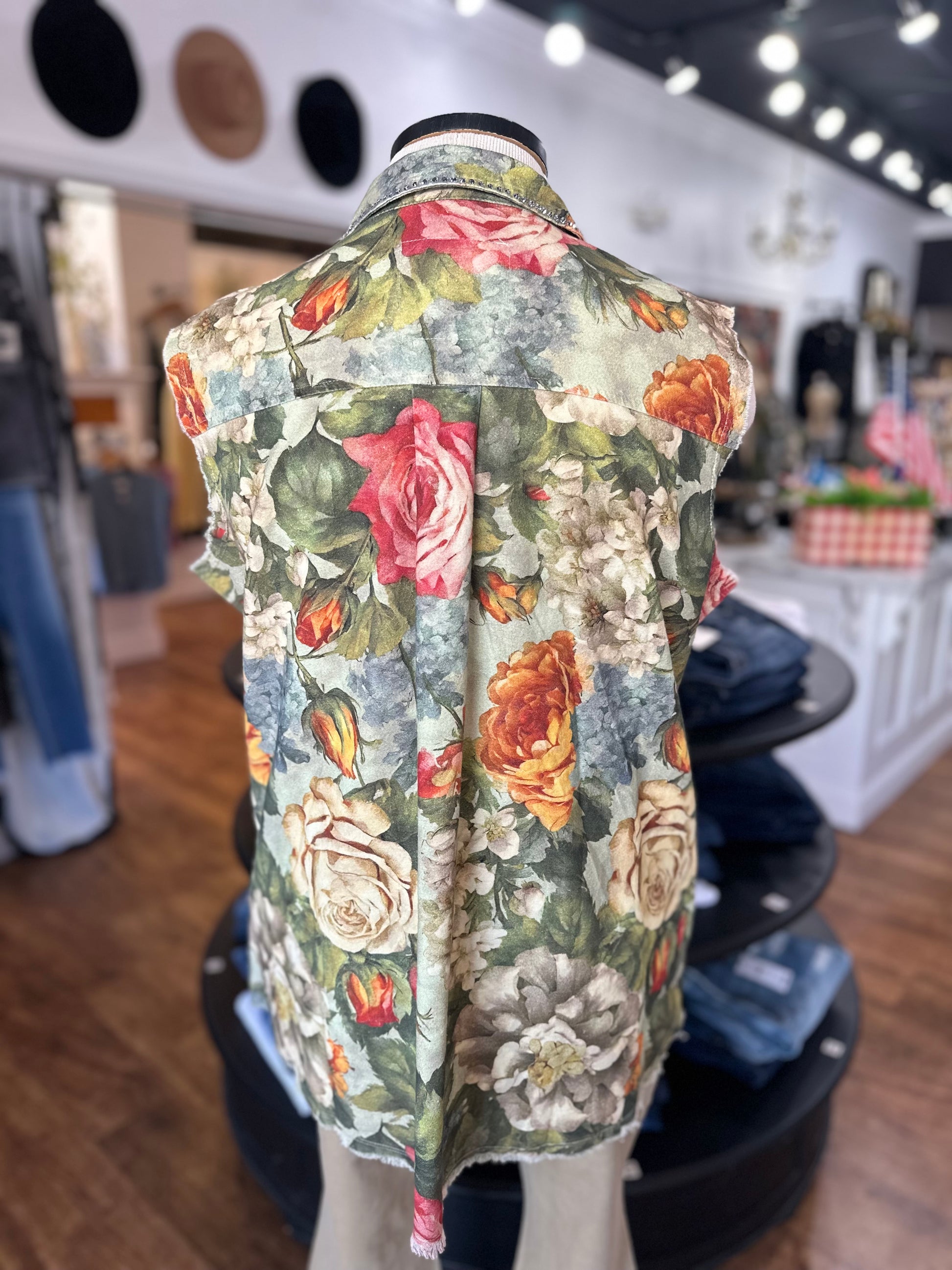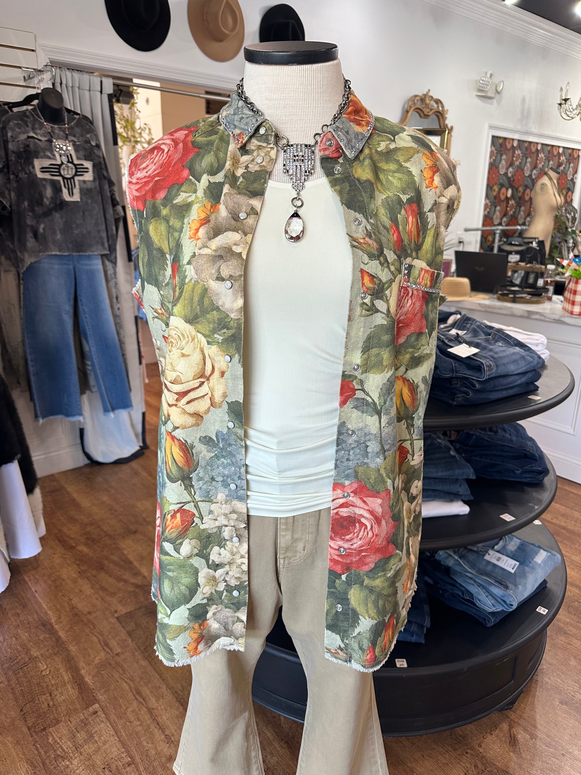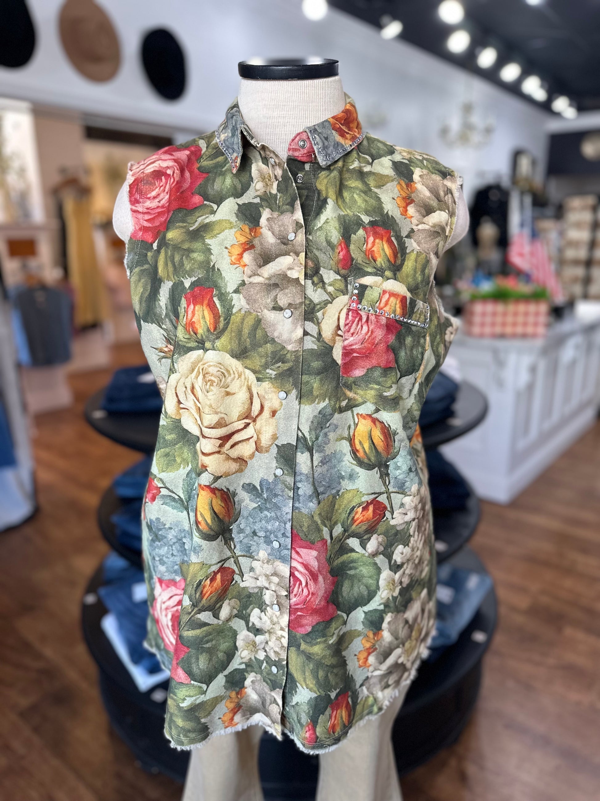 Brighten your look with the Florals Forward Sleeveless Vest, featuring a gorgeous floral print that pops with personality. Sparkling rhinestone accents on the collar and front breast pocket add just the right touch of sparkle. Designed with a fun snap closure and raw edge details, this vest brings playful charm to any outfit while keeping things cool and breezy. Perfect for layering or wearing solo, it’s a fresh way to flaunt your floral flair!