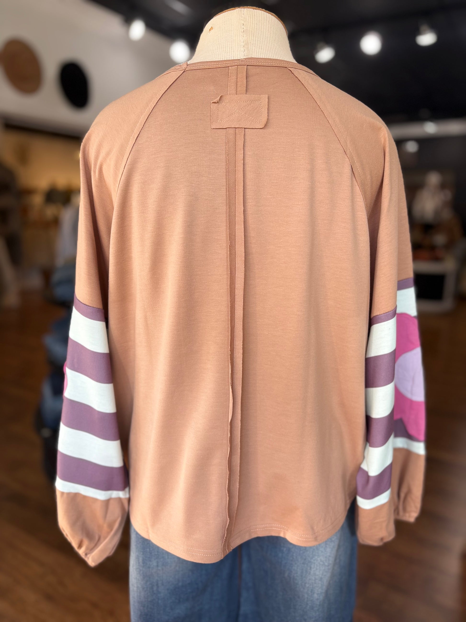 Bring a burst of fun to your wardrobe with the Flower Power Patchwork Sweatshirt. This loose-fitting raglan top features charming puff sleeves adorned with a colorful flower striped patchwork design. Elastic cuffs add a comfy snug finish while exposed seams give it an artsy edge. The rounded neckline keeps it casual and easy to wear for playful, everyday style.