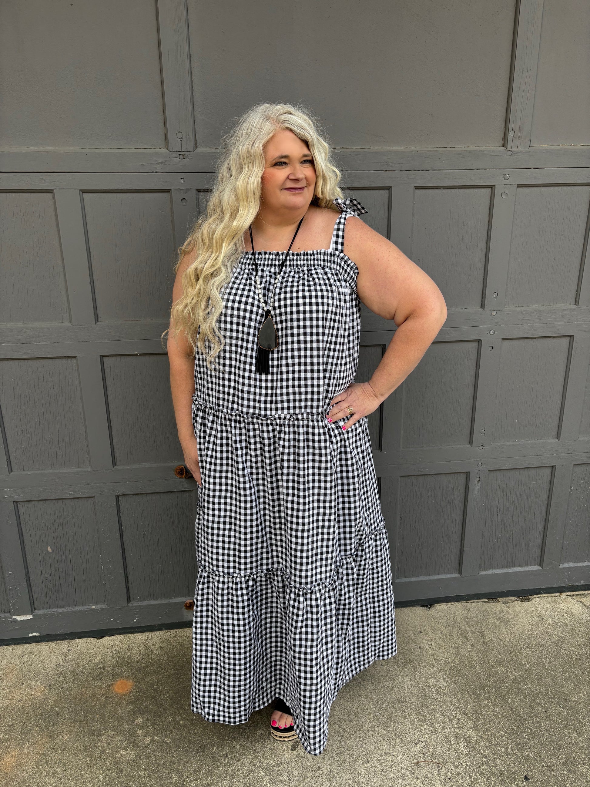 Introducing the ultimate summer must-have, the Front Porch Swinging Gingham Maxi Dress! With its tiered maxi length and flowy fit, you'll turn heads and stay comfortable all day long. The gingham print adds a touch of nostalgia, while the adjustable straps and elastic neckline provide a customizable fit. Get ready for some serious porch swingin' in style.
