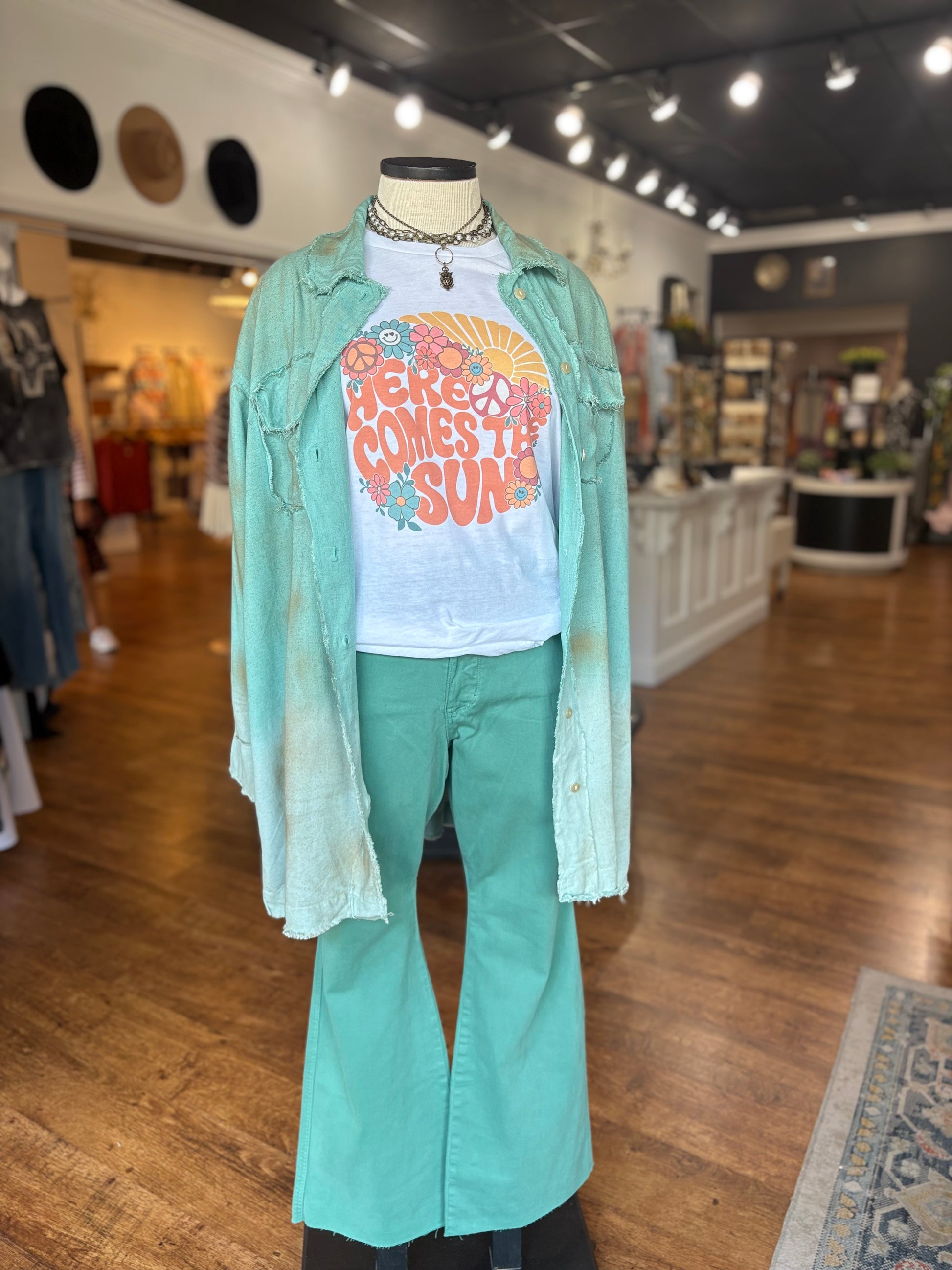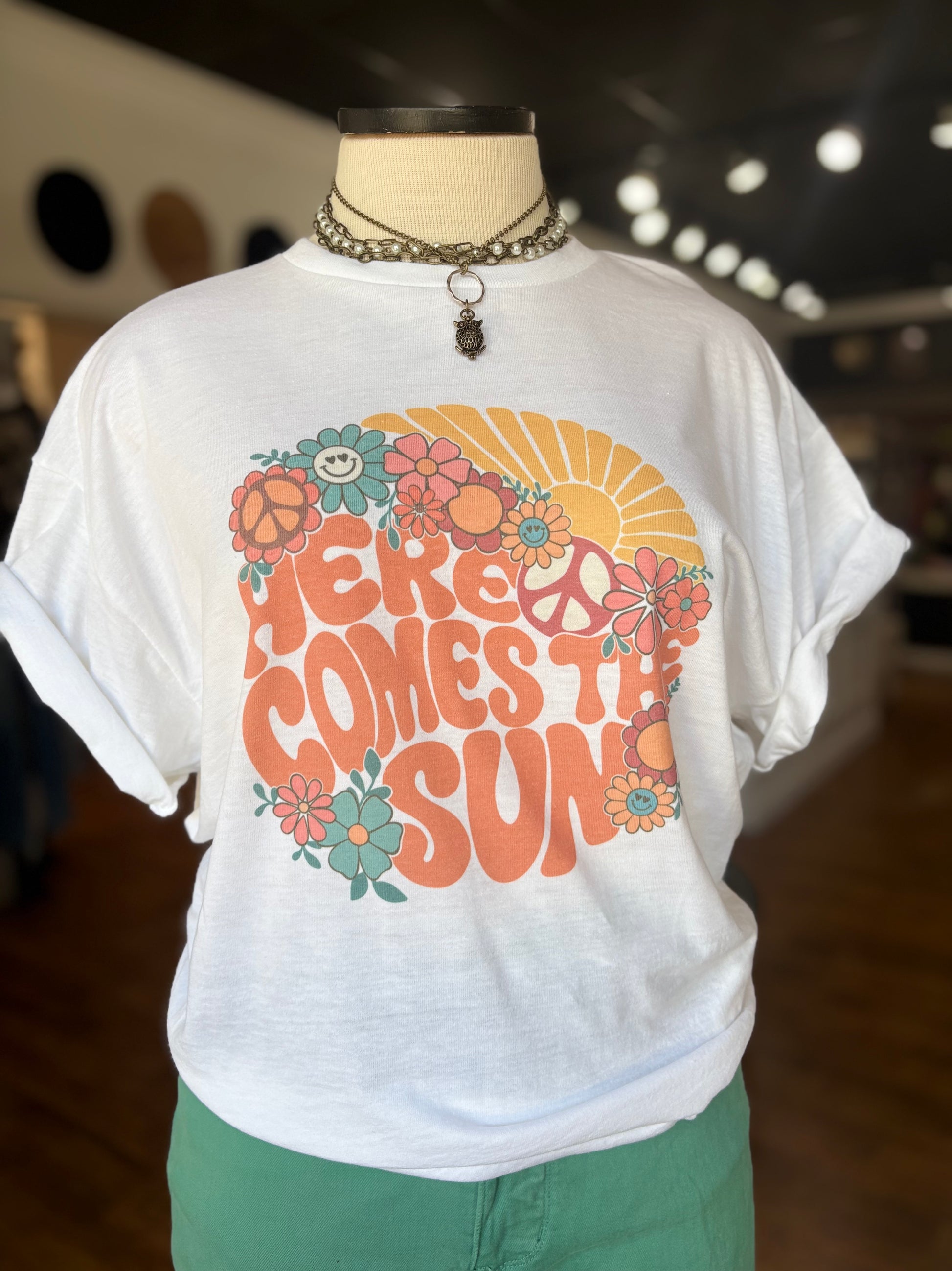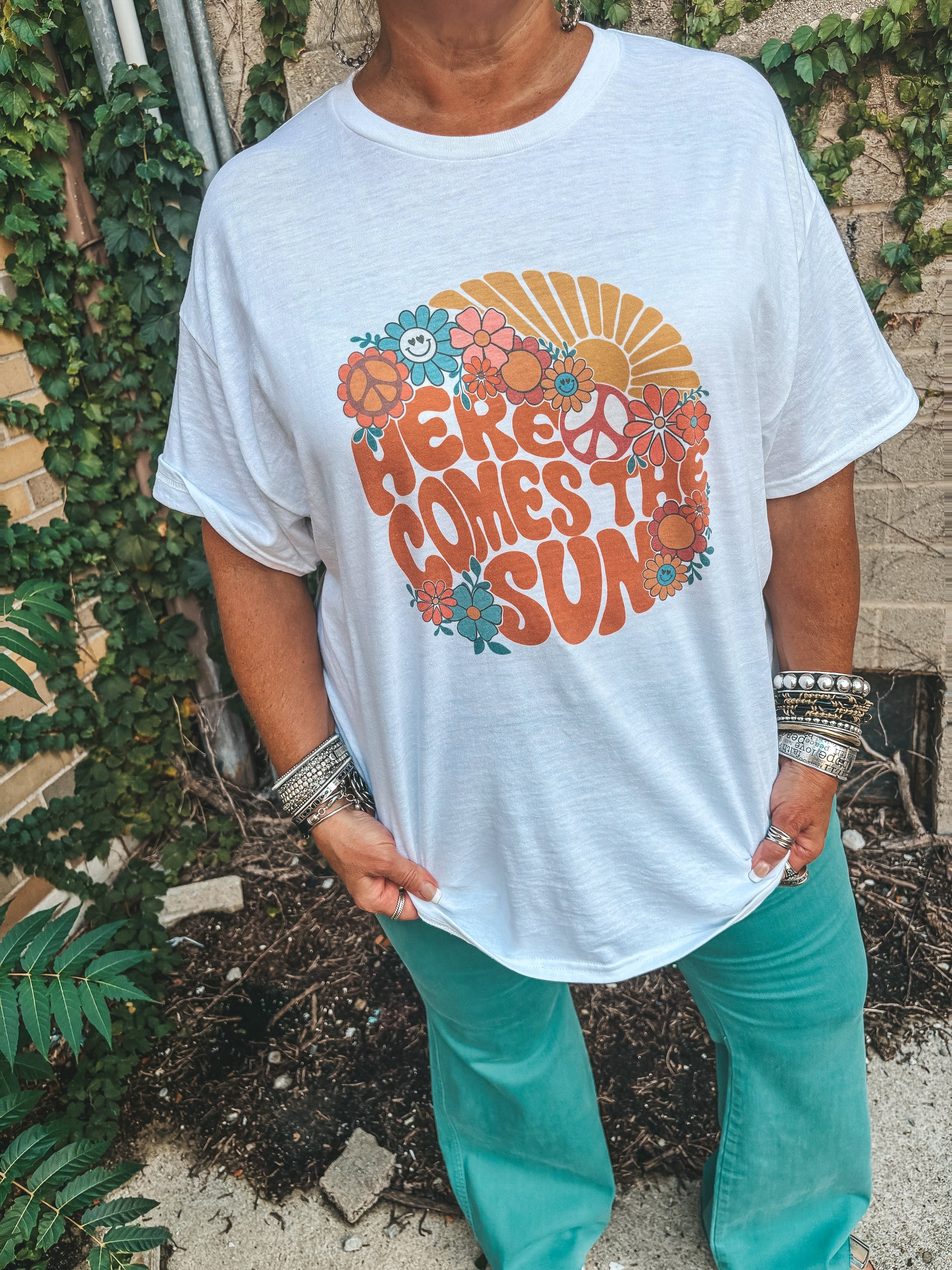 Brighten your day with the Here Comes The Sun Graphic Tee, designed to bring all the good vibes your way. This playful tee celebrates the joy of chasing sunshine and welcoming brighter moments. Perfect for sunny strolls or casual hangouts, it’s your go-to for a cheerful, lighthearted look that says it’s all right to shine. Embrace the warmth and spread positivity wherever you go!
