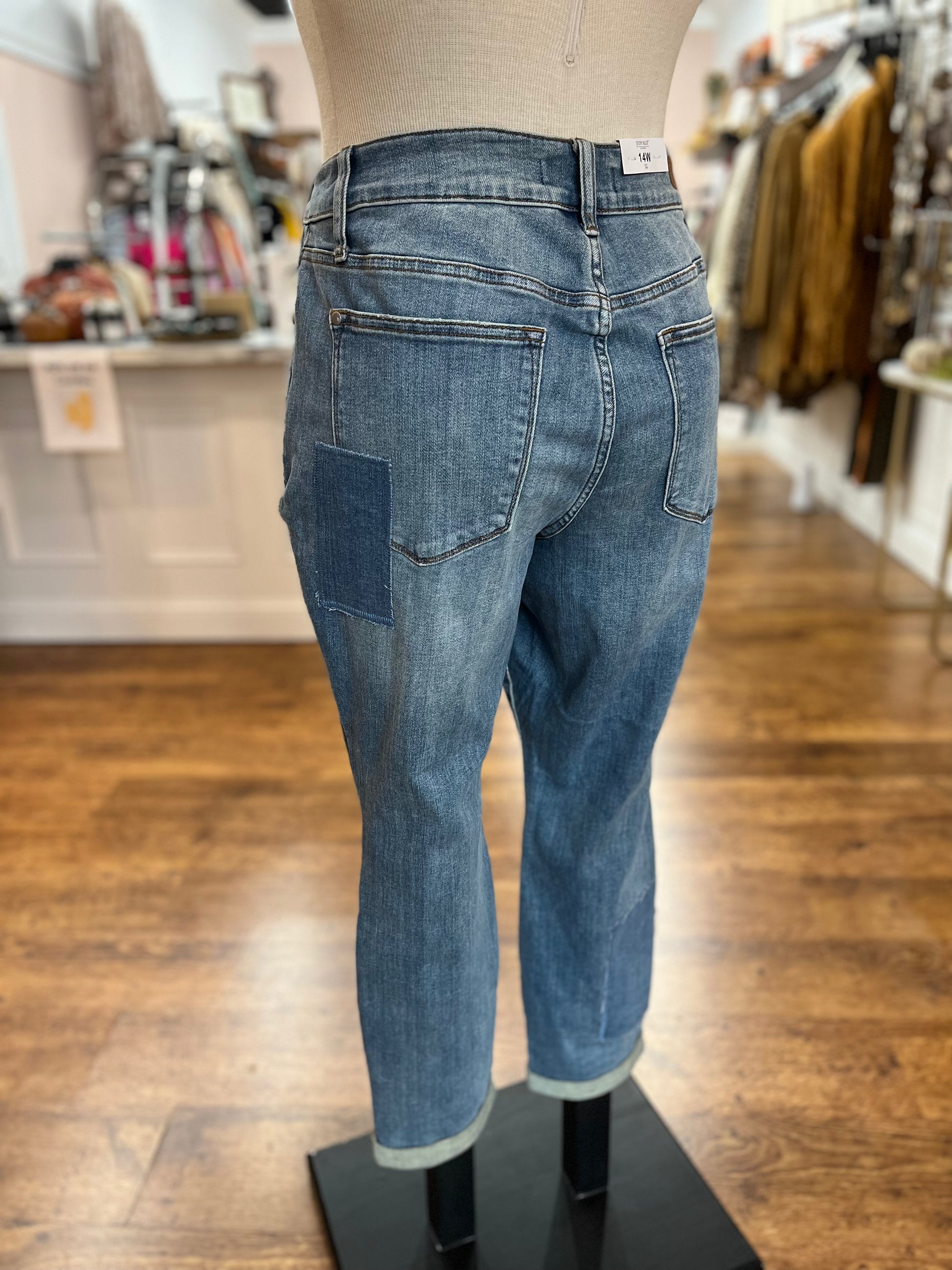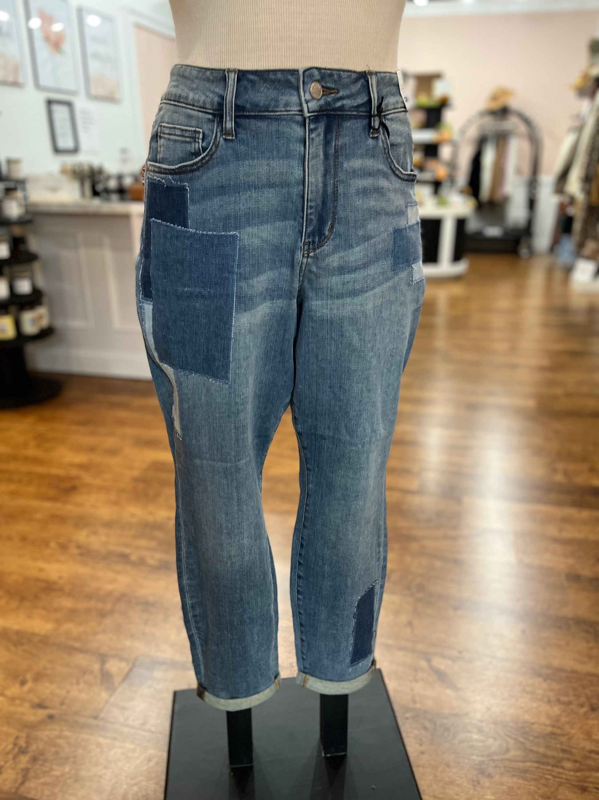 We have been waiting for these from market! These jeans are amazing!! Judy Blue jeans never disappoint and these patch jeans are no exception! These feature a double cuff at the bottom which can be uncuffed if desired. The highlight of these jeans is the patch pattern throughout - features different shade of denim all over! Plus - these have no distressing so they are perfect for work!
