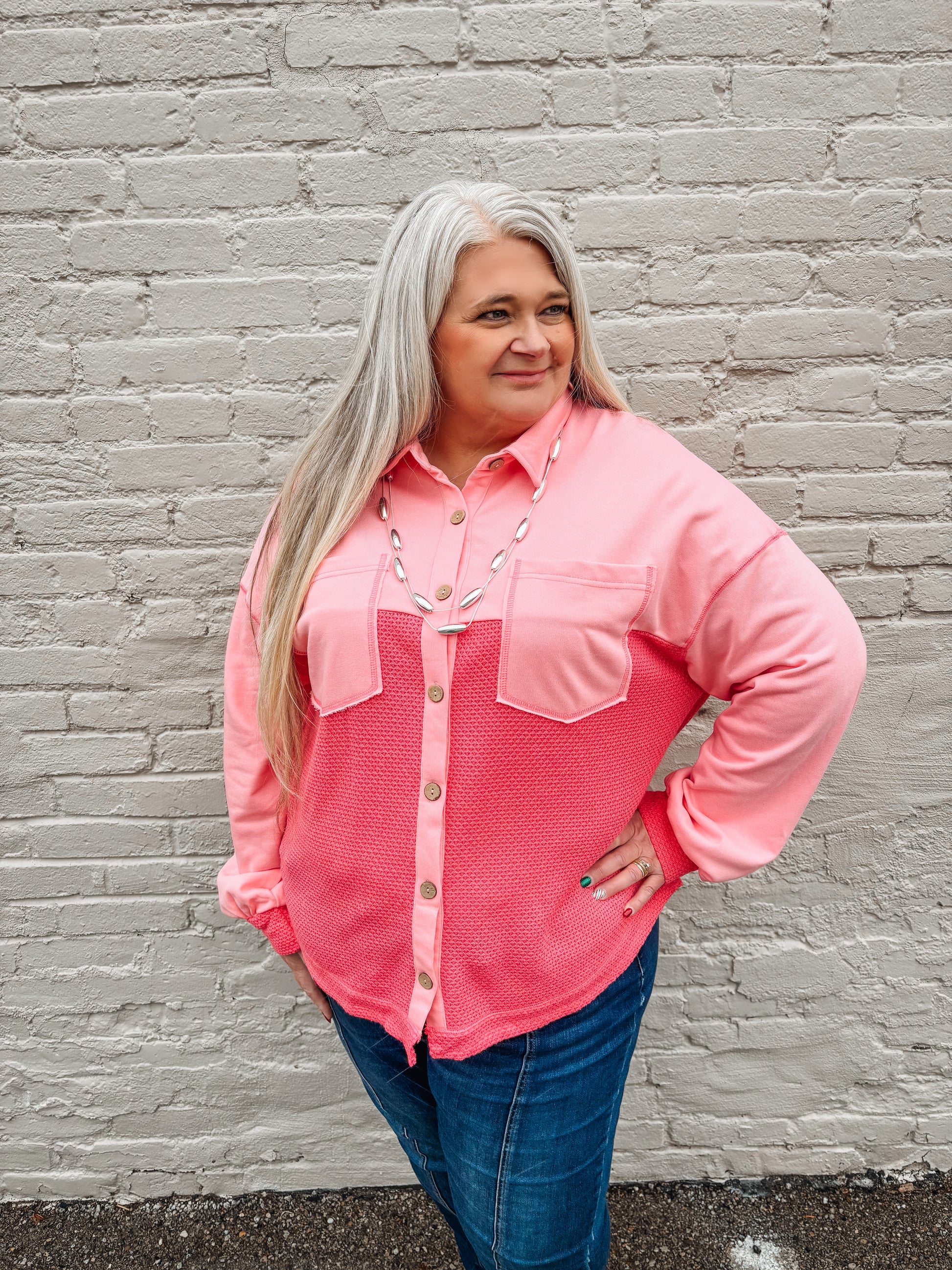 Layer up with personality in this charming waffle shacket that's part shirt, part jacket, all style. The two-tone design keeps things visually interesting, while the textured waffle knit adds cozy dimension. Long sleeves, a crisp collar, and front button closure make it easy to dress up or down, and those two front pockets? Perfect for stashing essentials or just looking effortlessly put-together. Whether you're heading to brunch or running errands, this versatile piece makes a lasting impression.
