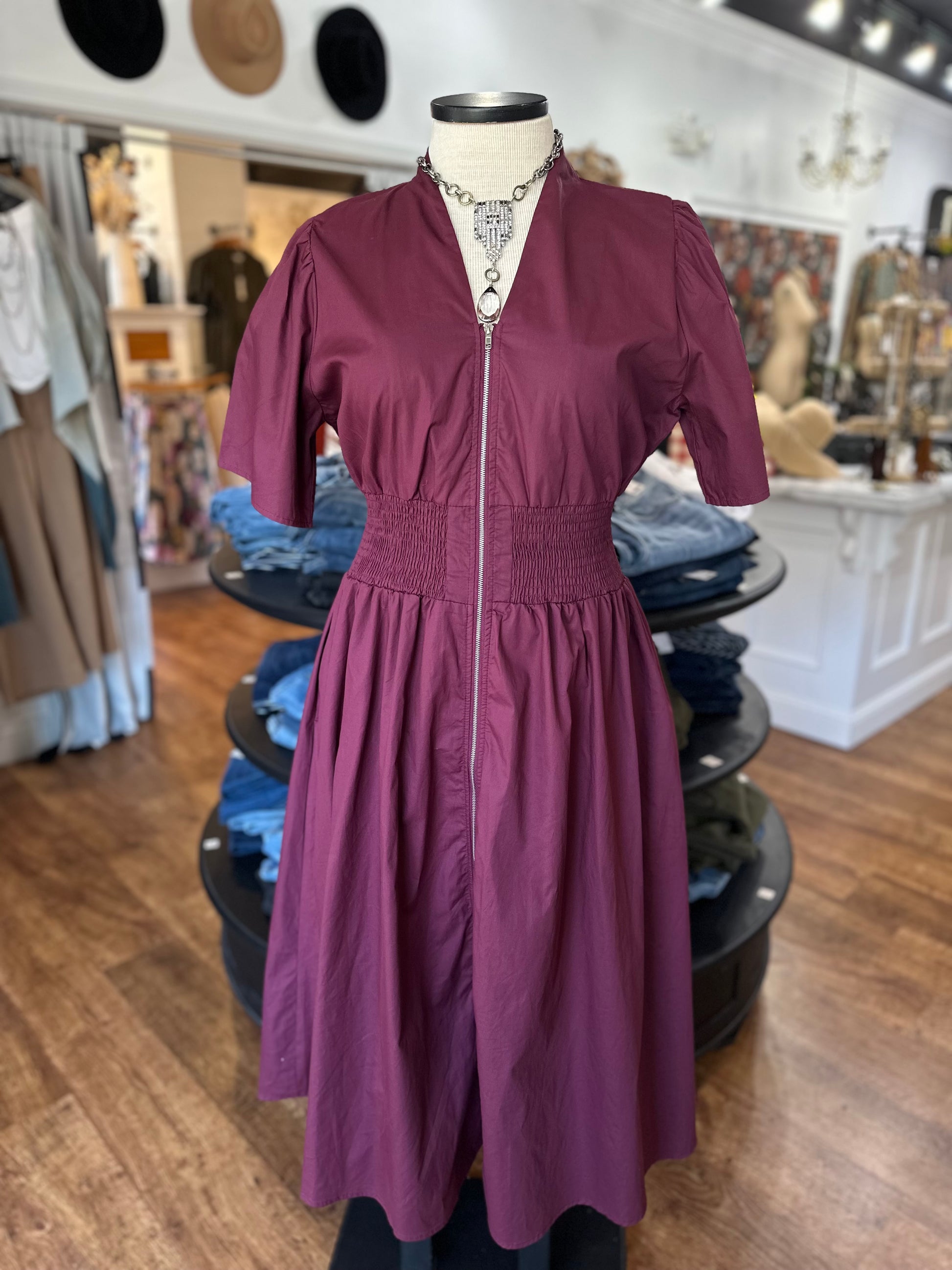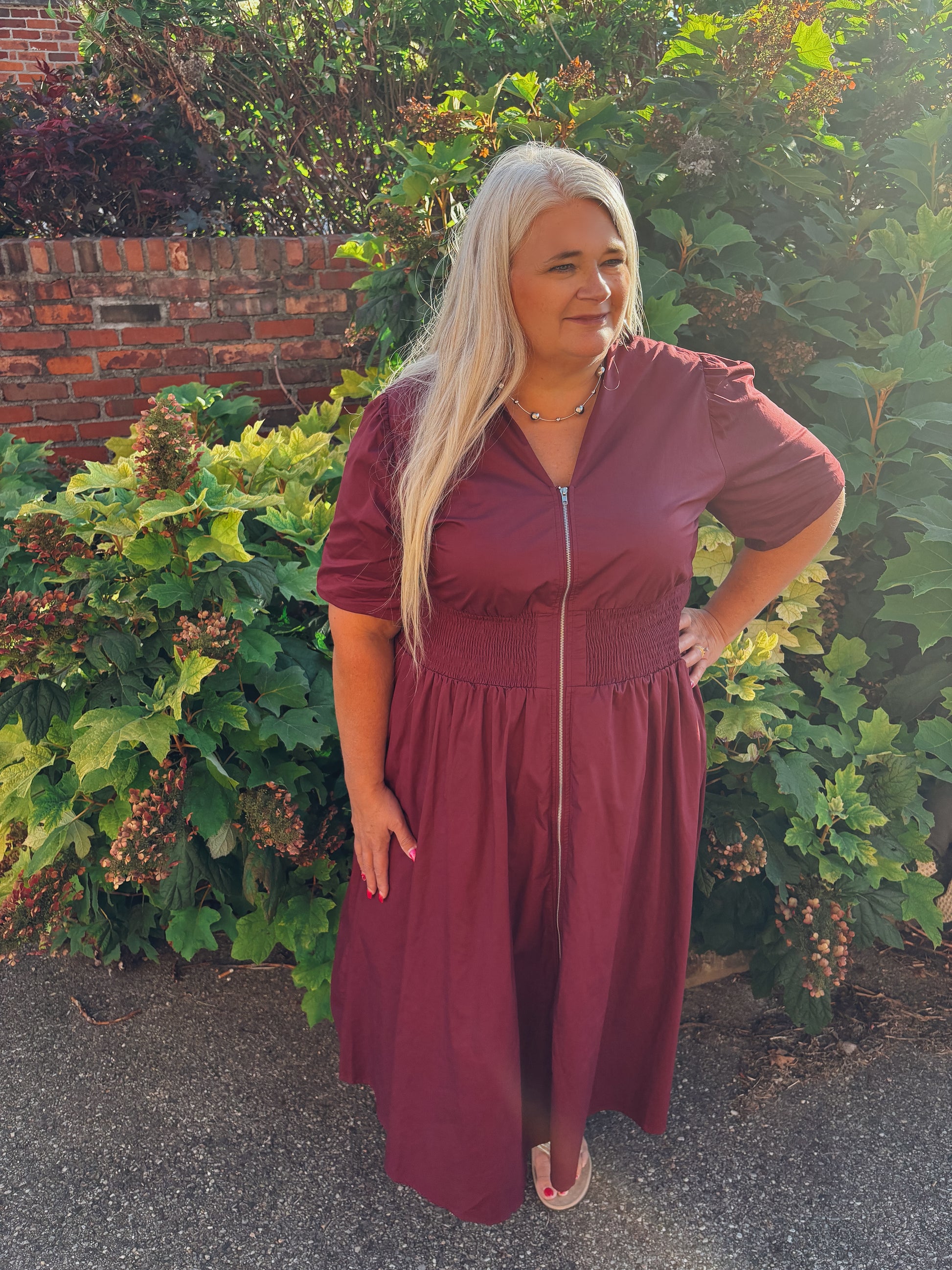 Embrace effortless style with the Living For The Moment Dress. Featuring playful short sleeves and a comfy smocked waist, it flatters every figure. The front zip adds a fun twist, while handy pockets keep essentials close. Midi length and a solid color make it perfect for any occasion—ready to make every moment count!