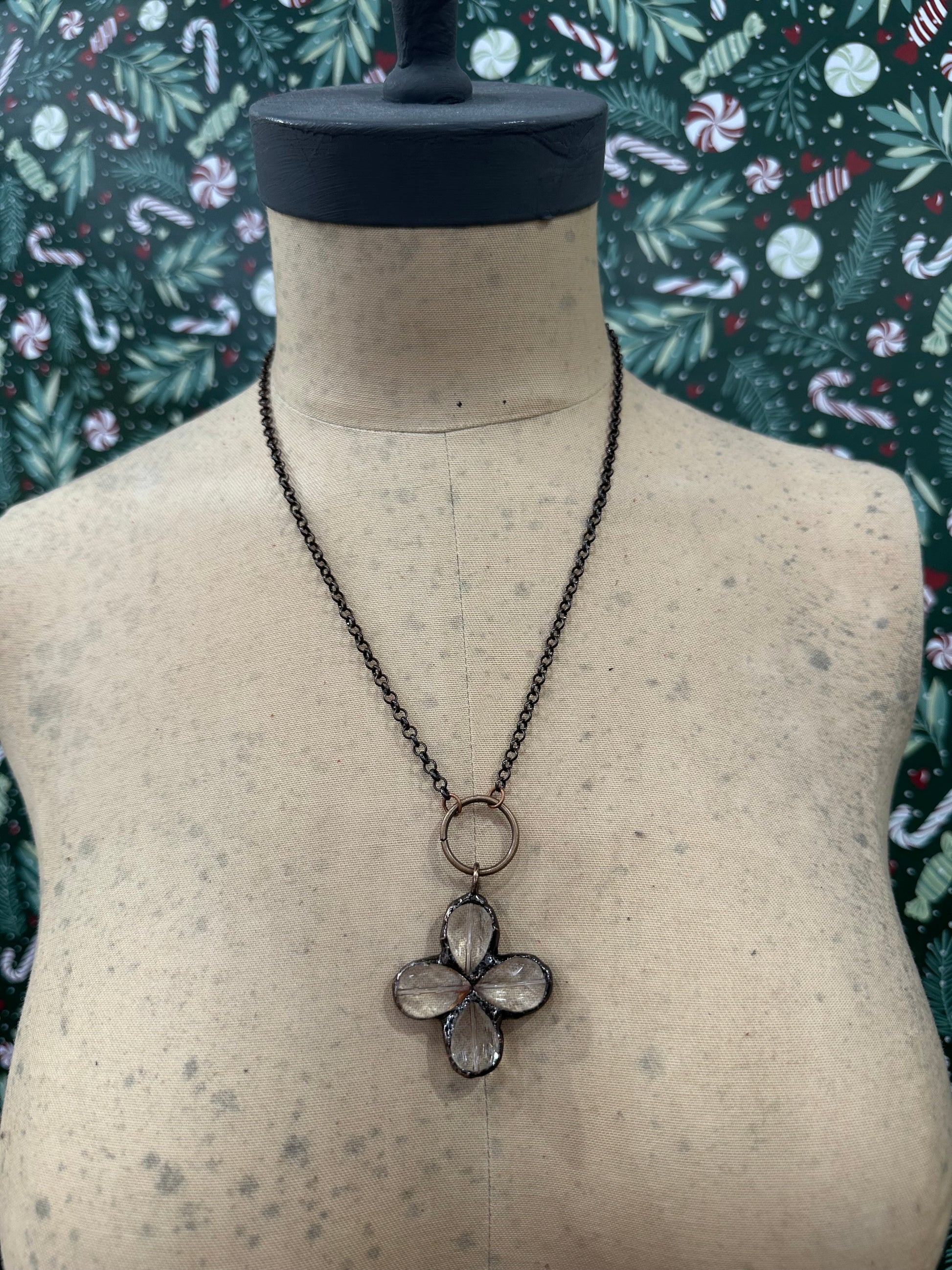 Embrace a little luck with this charming clover necklace! Featuring a delicate crystal clover pendant that catches the light beautifully, this piece combines whimsy with elegance. The warm copper chain pairs perfectly with a matching copper ring accent, creating a cohesive, eye-catching design. The sturdy toggle closure keeps your necklace secure while adding an extra touch of style. Perfect for layering or wearing solo, this playful accessory brings good fortune and fun to any outfit.
