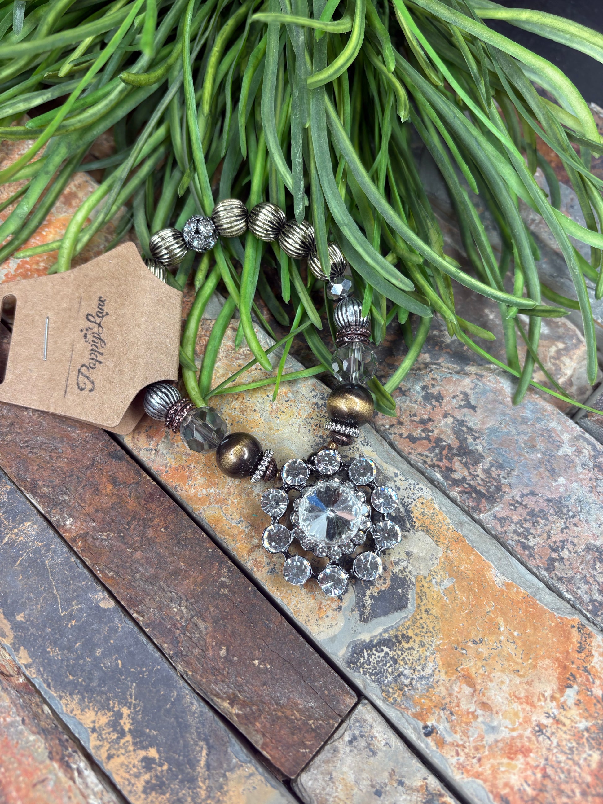 Add a touch of fun and sparkle to your look with the Midnight Sparkle Bracelet. Featuring a playful mix of faceted brass beads, shimmering rhinestones, and a standout large rhinestone flower charm, this stretchy bracelet effortlessly brightens any outfit. Perfect for adding a little sparkle to your day or night!