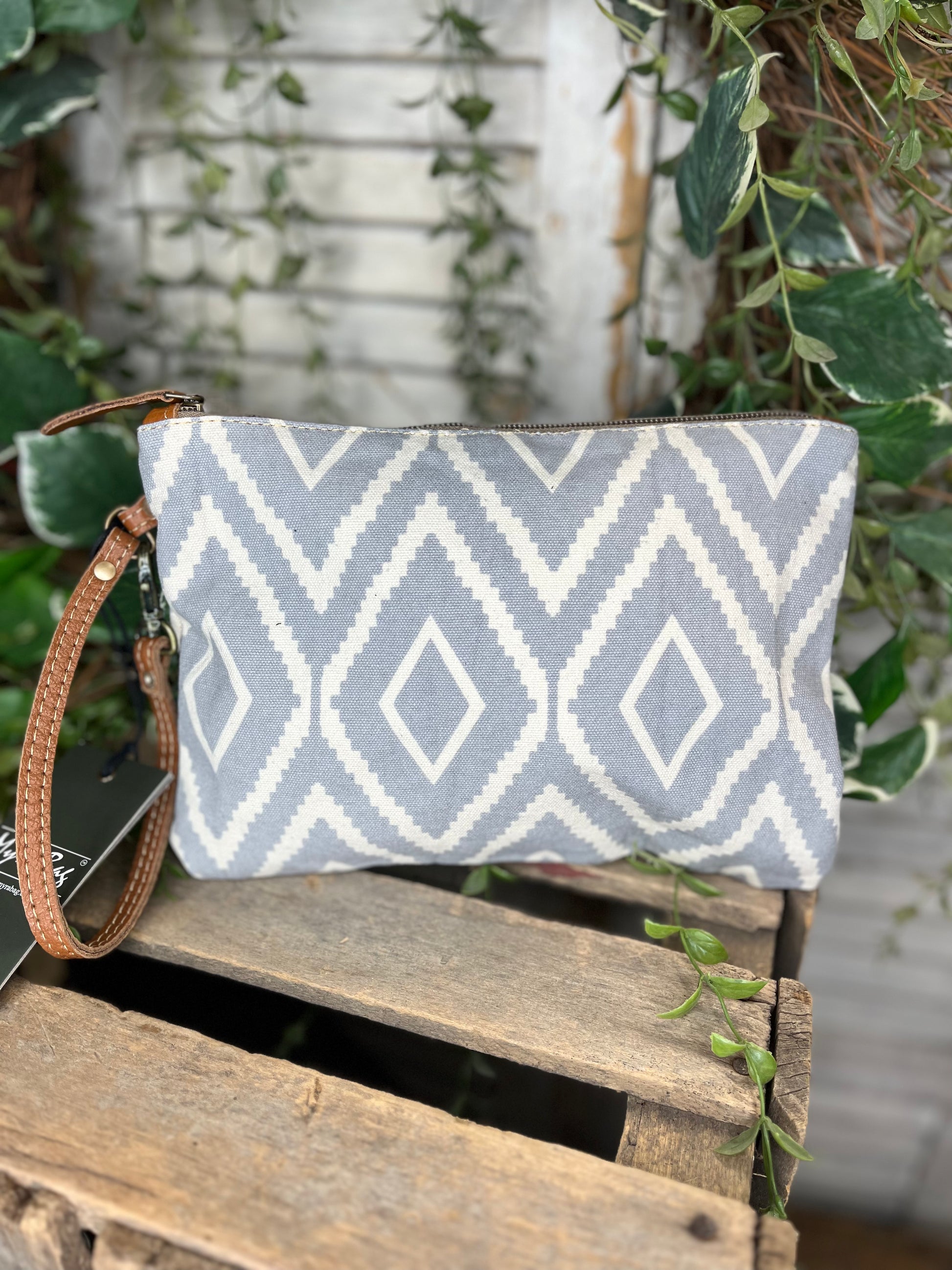 The woven canvas of this charming bag features a striking tribal-inspired pattern in soothing gray and white colors. Zipper close top keeps everything snug and secure. Features a wristlet carrying strap in warm brown leather. Always stylish with its beautiful, eye-catching design!