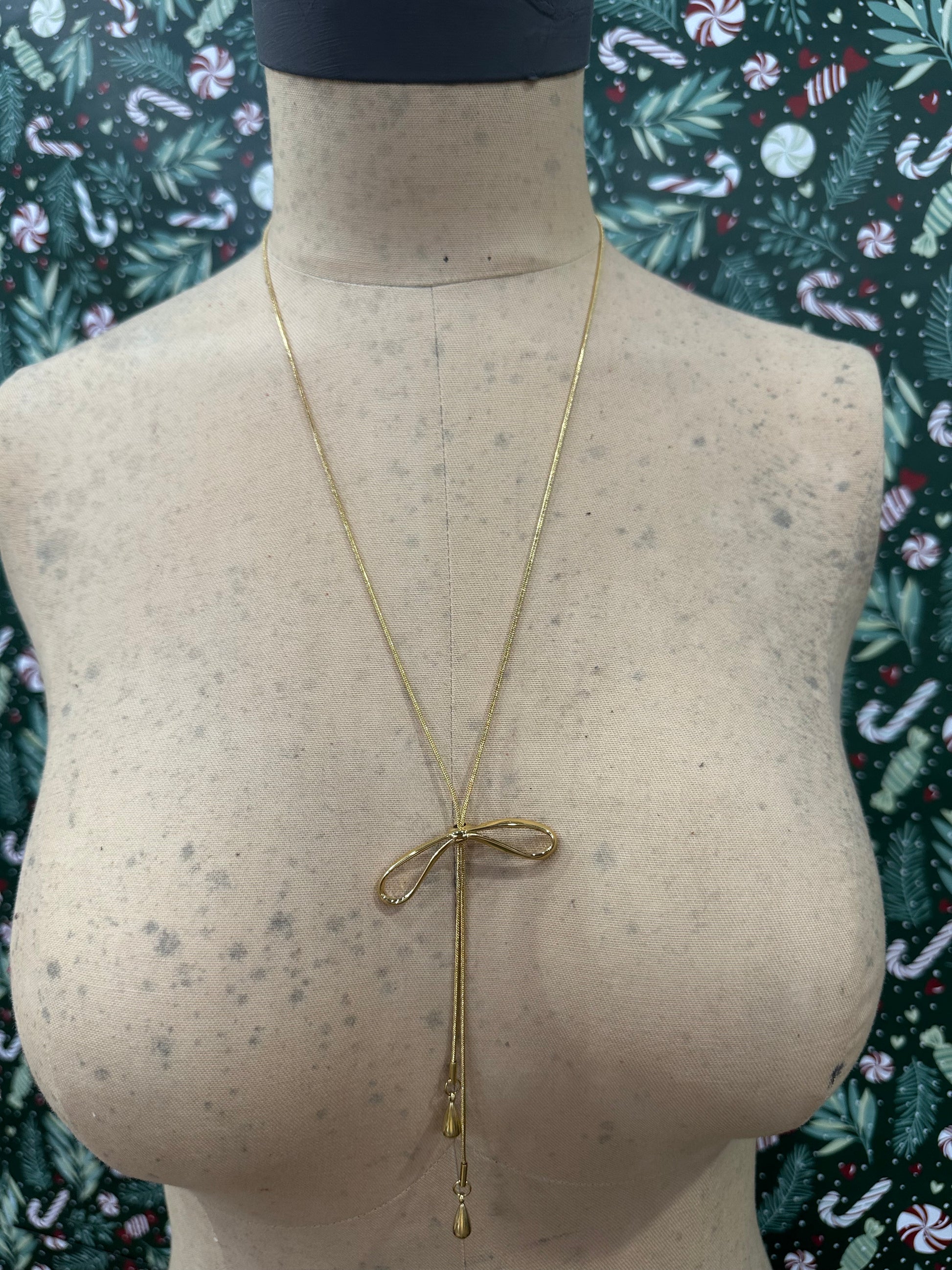 Forget complicated jewelry—this lariat necklace is the effortless way to elevate any outfit. Featuring an adjustable design that lets you customize the fit to your preference, it drapes beautifully with a charming bow accent at the center. Delicate teardrop dangles catch the light as you move, adding just the right amount of sparkle and movement. Whether you're dressing up for a night out or adding polish to your everyday look, this versatile piece works with everything in your closet. Simple to wear, impossible to mess up—just slip it on and go!