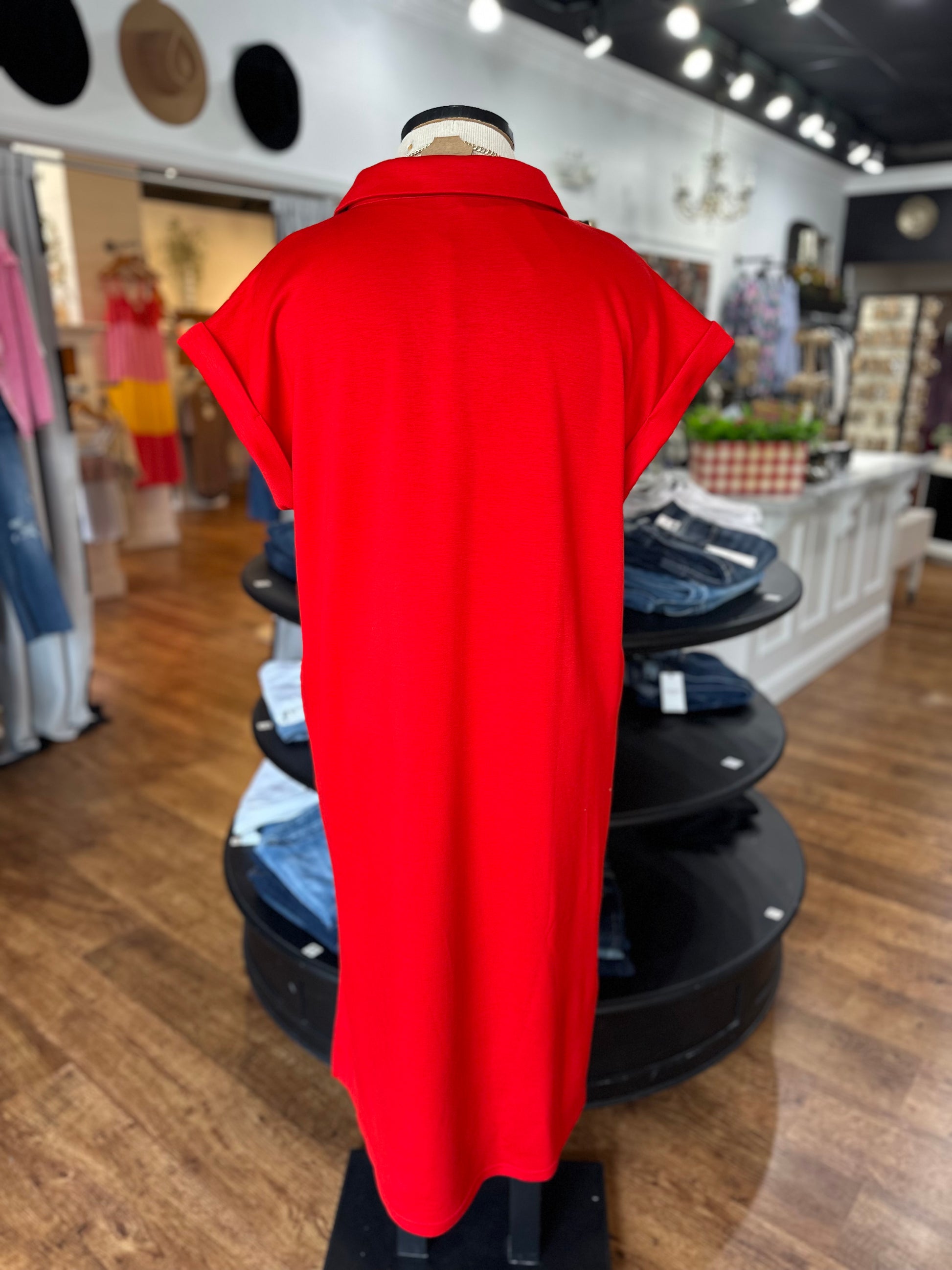 Step into effortless style with the Pursuit Of Happiness Dress. This solid midi dress features a playful open collared neckline and short kimono sleeves with wide banded cuffs for a chic twist. Practical side pockets and a subtle side slit add both convenience and flair, making it perfect for day-to-night adventures. Embrace comfort and confidence wherever you go!