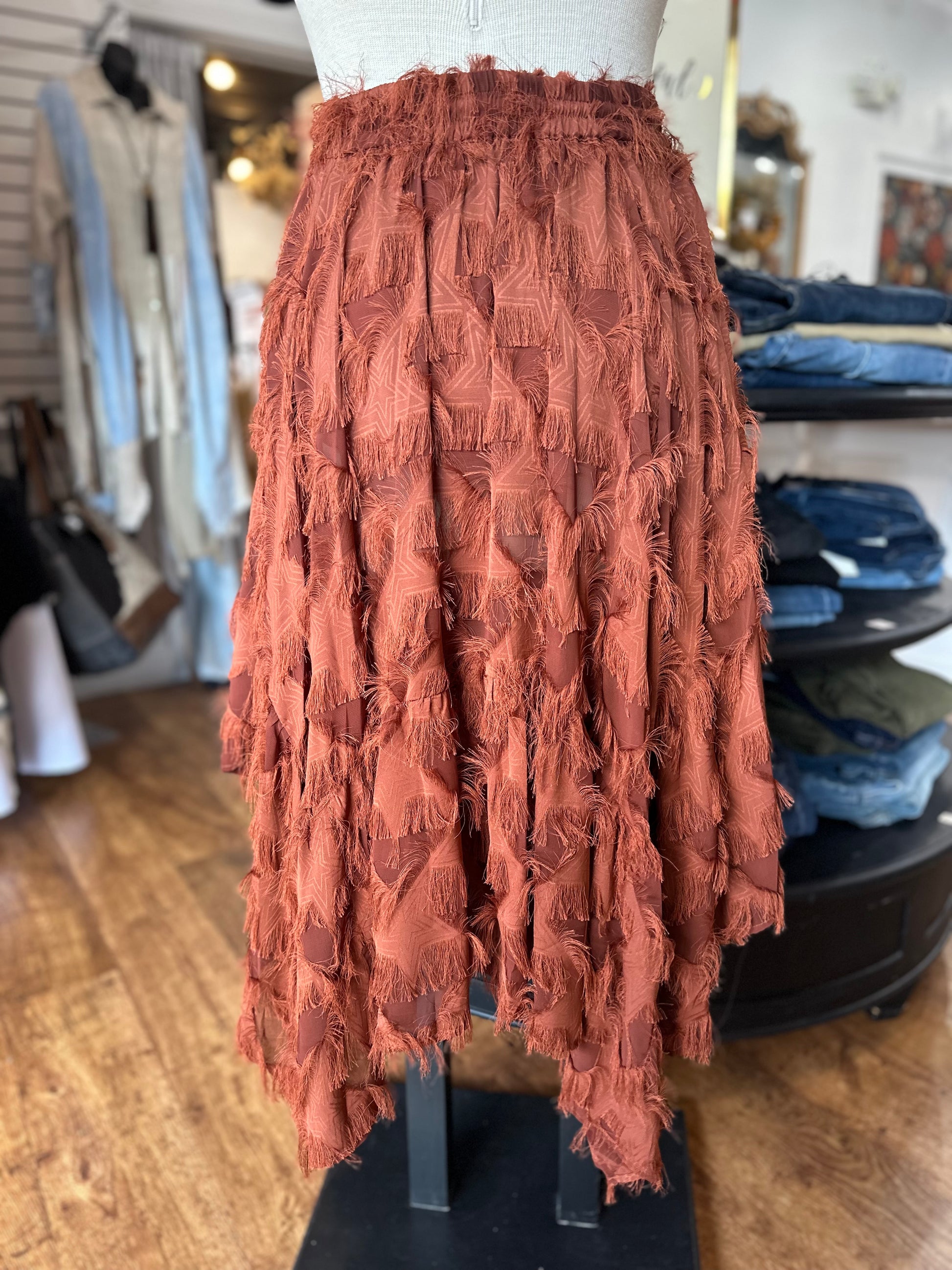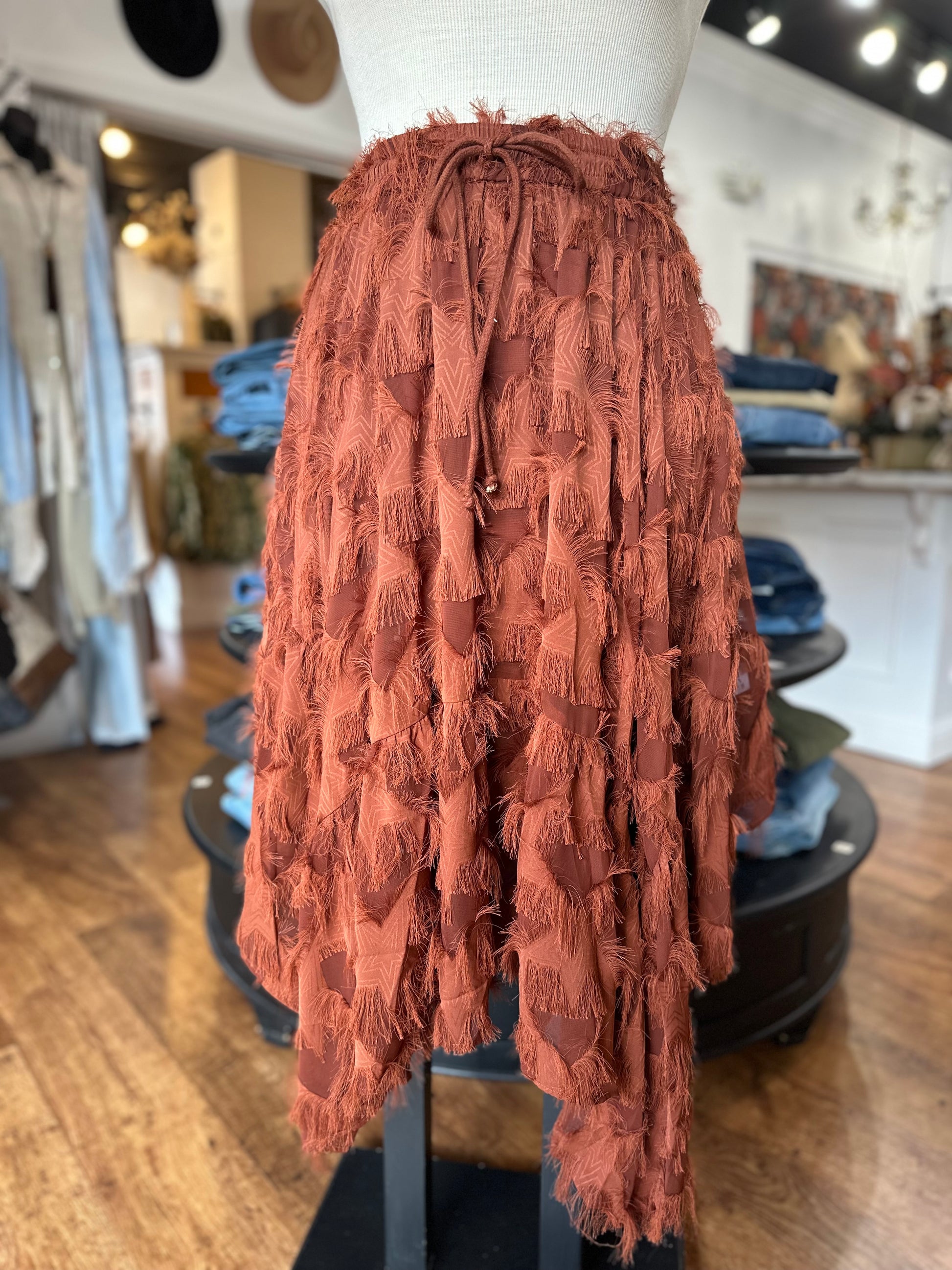 Add a touch of whimsy to your wardrobe with the Rust Star Skirt. Featuring playful fringe accents and a fun uneven hemline, this lightweight skirt dances with every step. The elastic waistband with a drawstring tie ensures a comfy fit, while subtle star patterns and delicate lines add a hint of sparkle to your look. Perfect for days when you want to feel light, breezy, and effortlessly stylish.