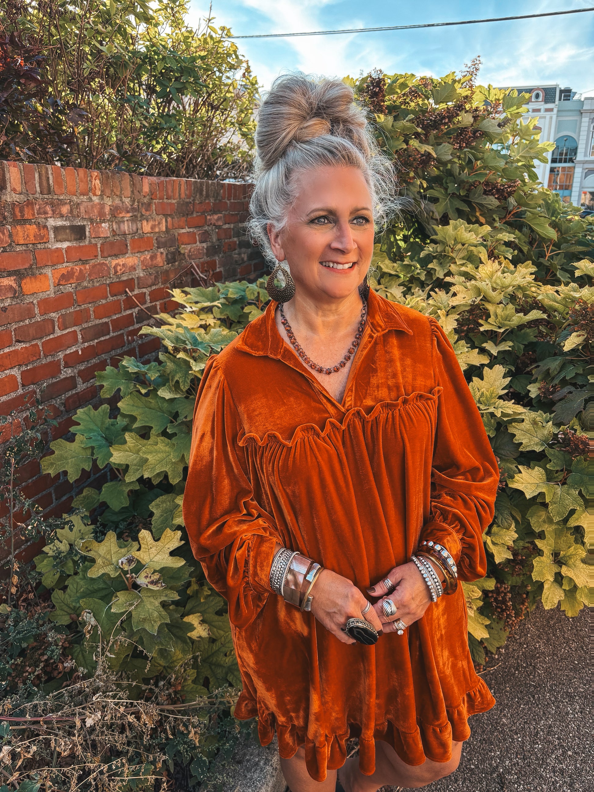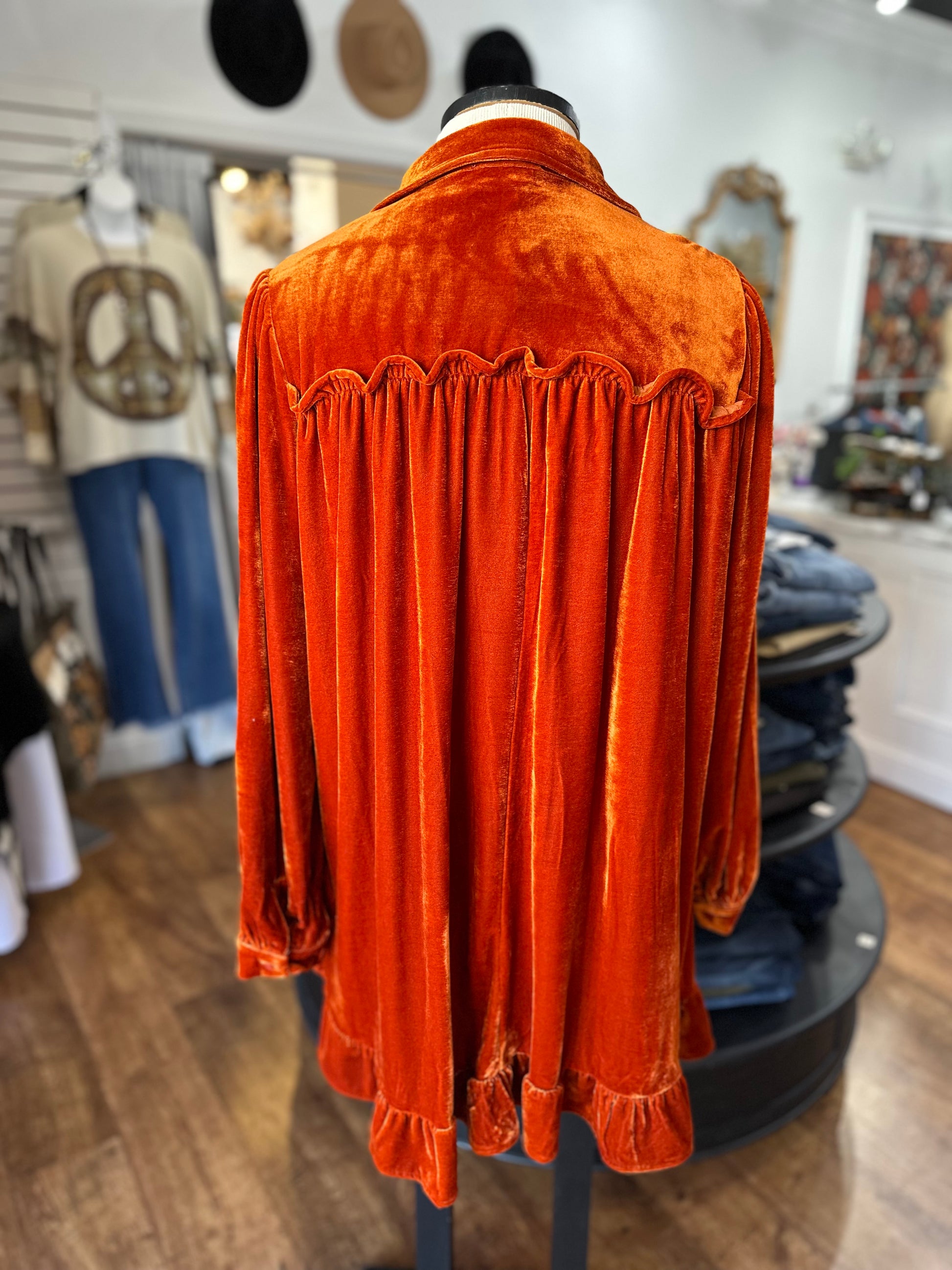 The Simple Grace Velvet Dress brings cozy elegance with its long bishop sleeves and playful ruffled hemline that dances with every step. A collared neckline and button cuffs add charming detail, while ruched accents create flattering texture. Side pockets make it as practical as it is pretty, and the relaxed, loose fit offers a flowy silhouette perfect for twirling through any occasion.