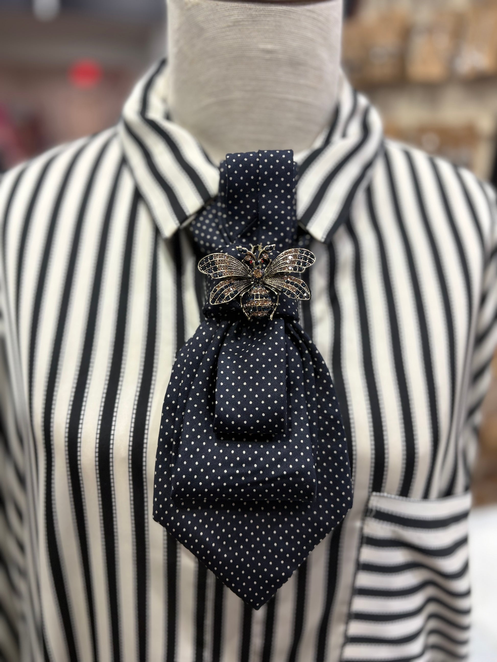 This striking necktie necklace pairs timeless sophistication with a bold statement. The polka dot pattern provides classic charm, while the dark bee adds an unexpected twist—a nod to nature's most industrious creature. Perfect for anyone who refuses to choose between refined elegance and a little rebellious flair, this accessory transforms an ordinary outfit into something memorable. Wear it and let your style buzz with personality.