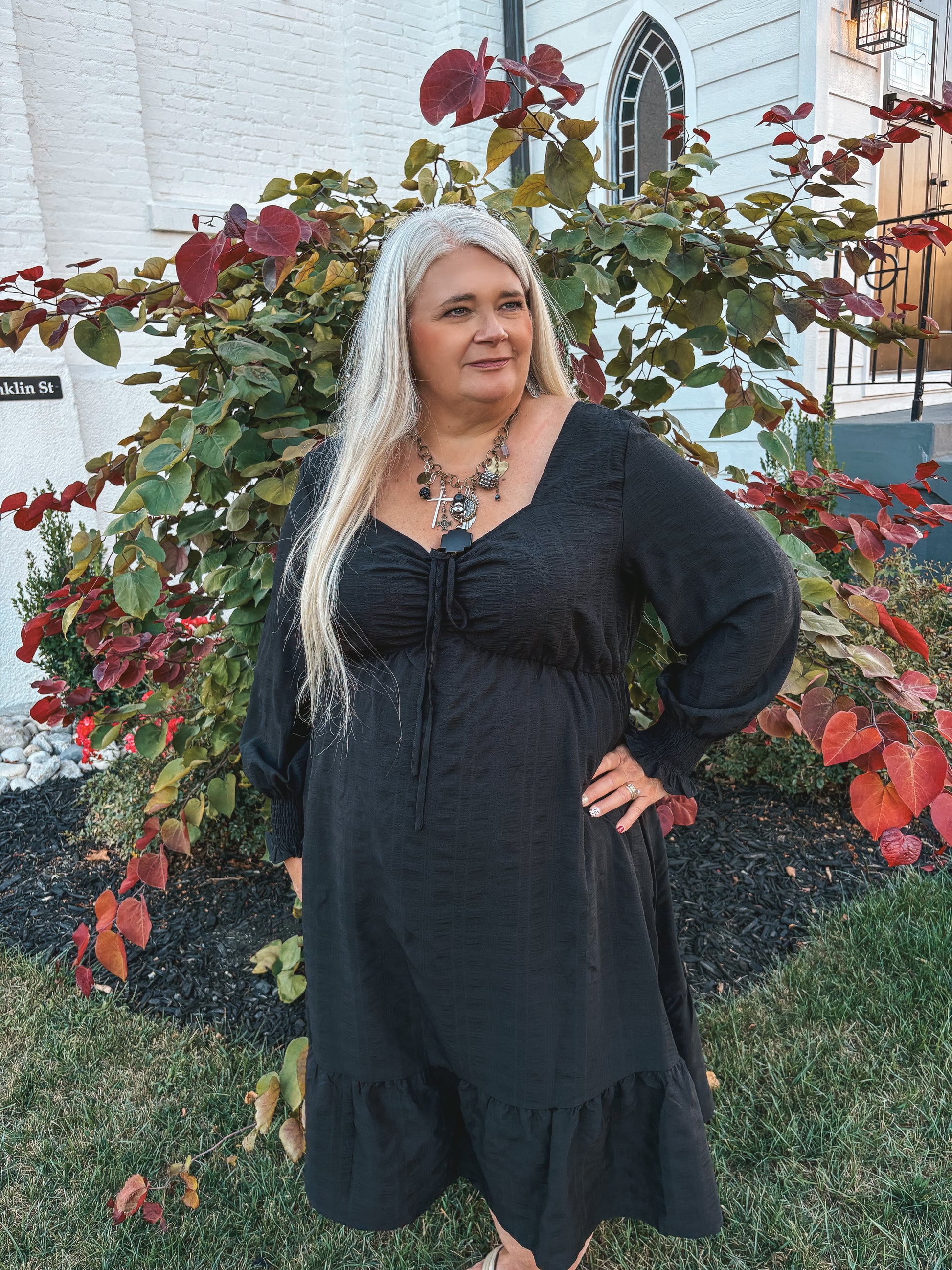 Step out with style in the Something Extra Black Midi Dress. This playful piece features a chic lace-up ruched bustline for a flirty touch, long sleeves with wide smocked cuffs adding comfy elegance, and a ruffle hemline that dances with every step. Perfectly midi in length, it balances grace and fun for any occasion.