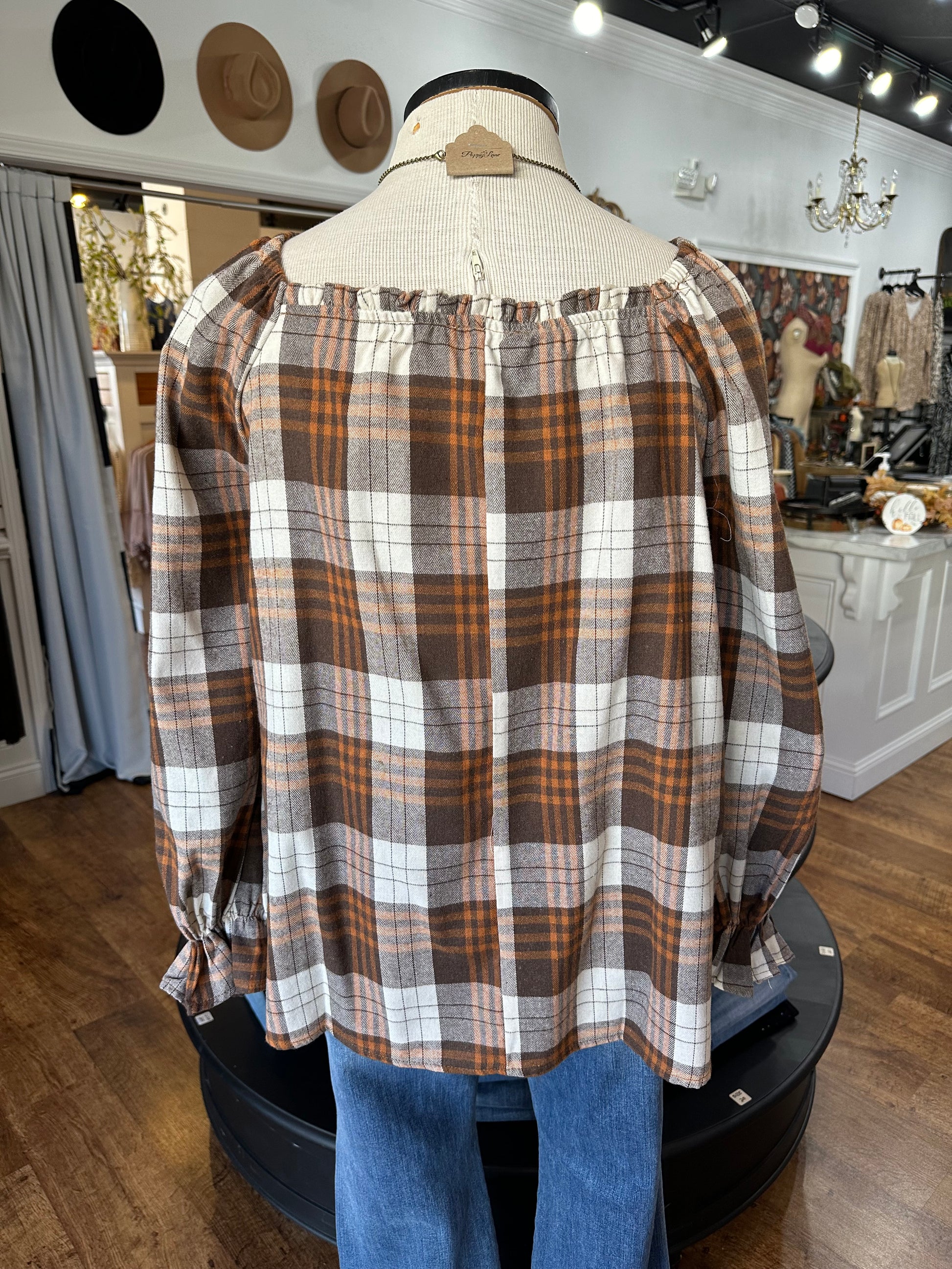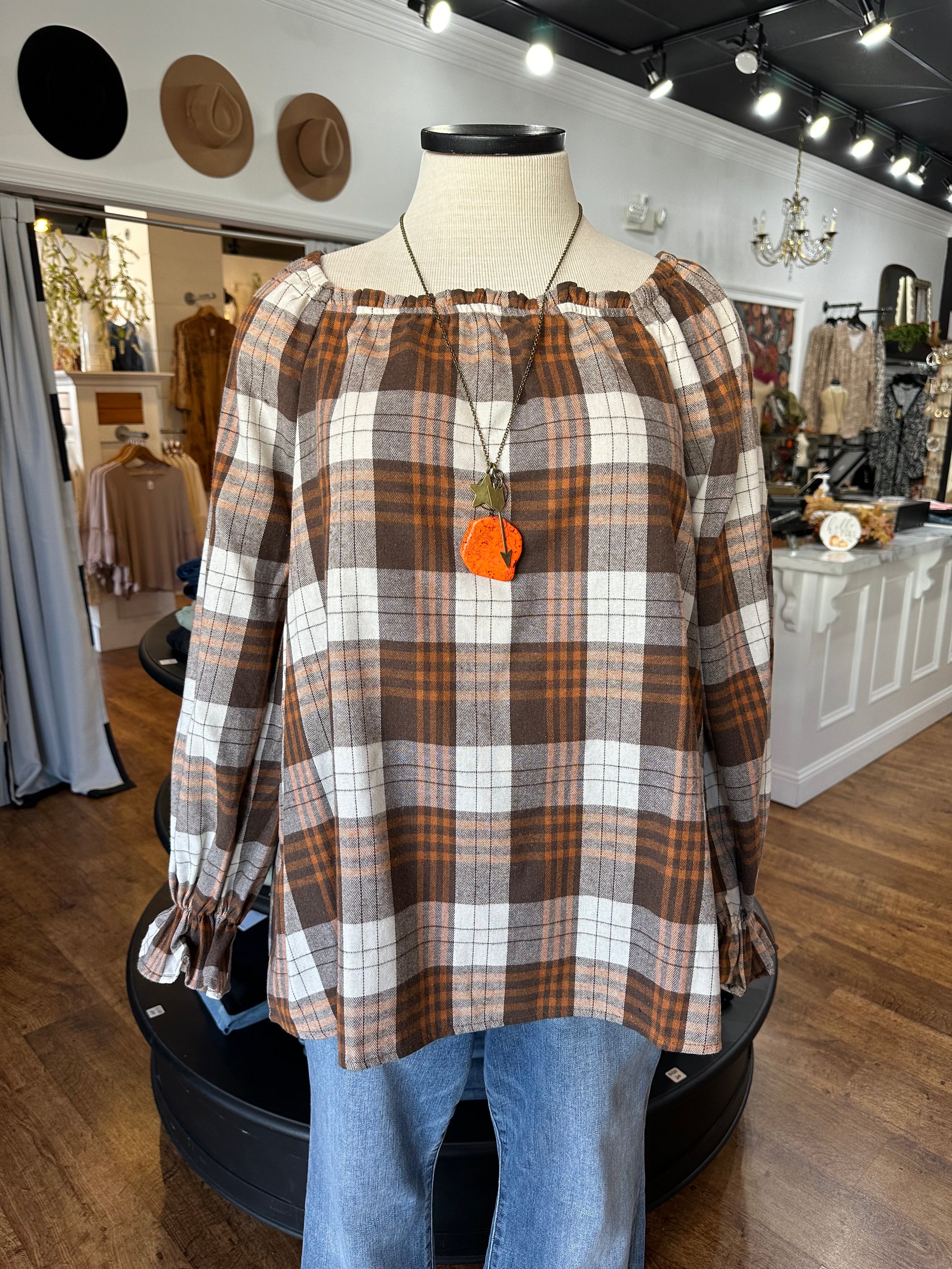 This Steal Away Plaid Top is a stylish choice with its elastic square neckline and peasant-inspired design. The long sleeves with elastic cuffs add a touch of elegance while the plaid pattern adds a fashionable touch. Stay comfortable and chic with this versatile top.