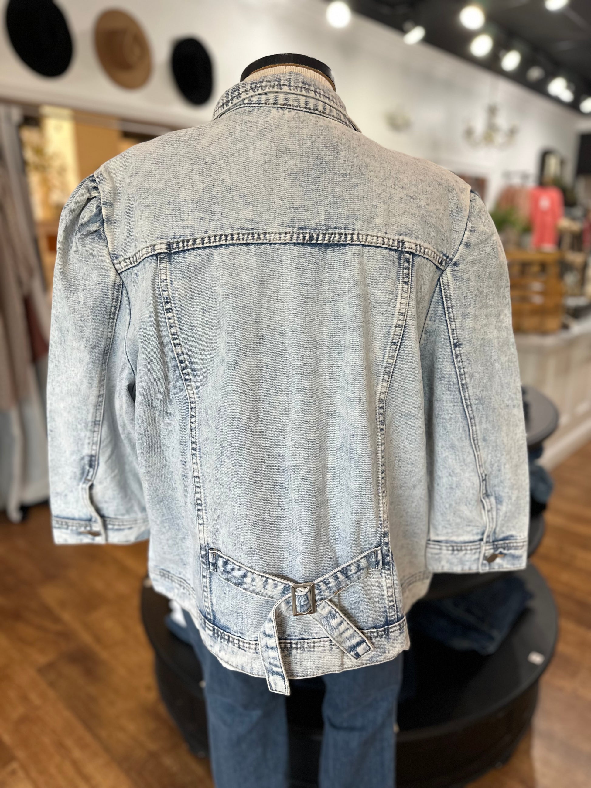 Rock the perfect blend of edginess and style with our Street Chic Denim Jacket. This jacket features long sleeves and a button-up front for a classic look, while the collared neckline, button cuffs, and cinch accent on the back add unique touches. The slight distressing gives it a cool, effortless vibe. (No more boring outerwear!)