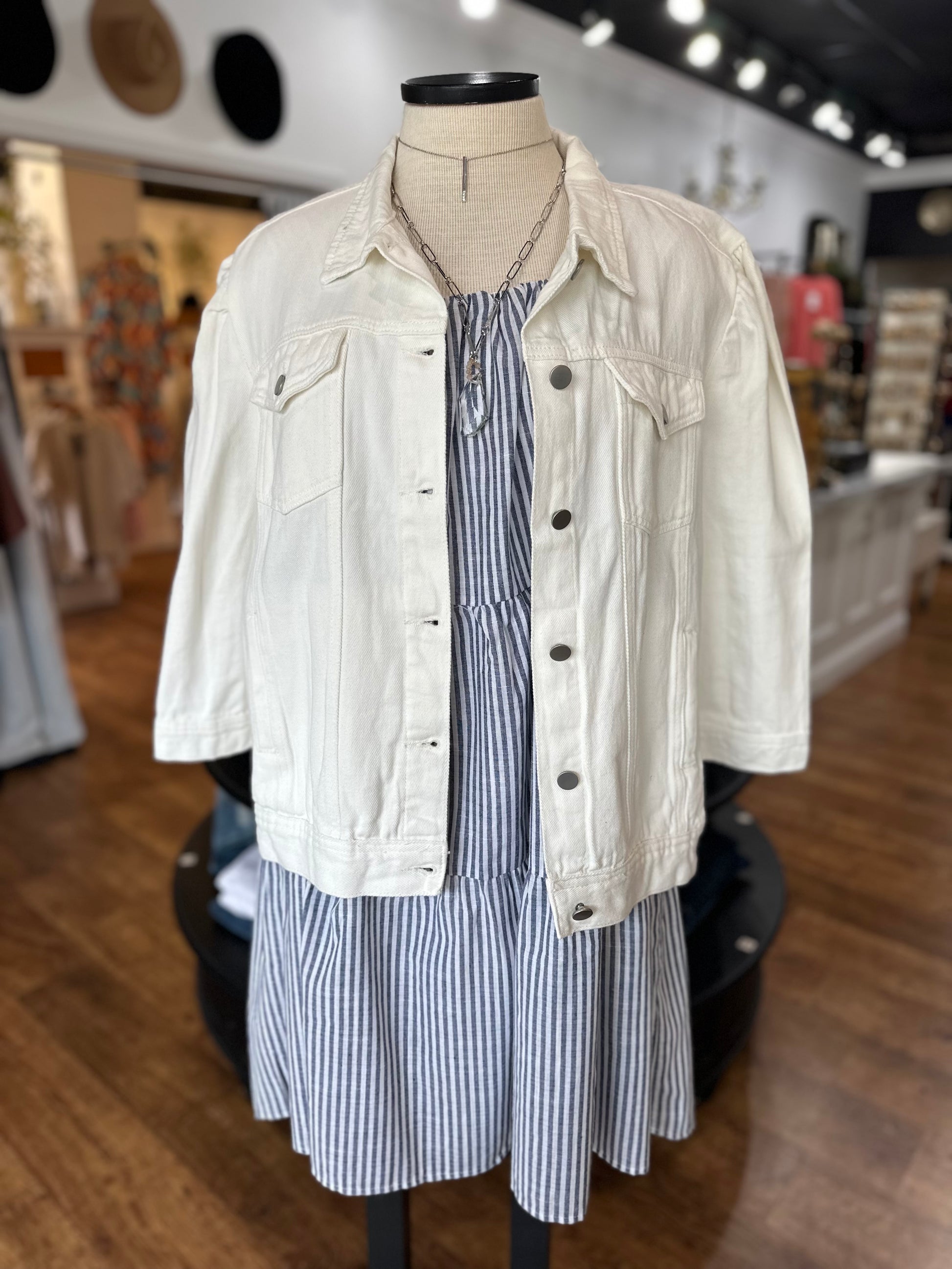 Rock the perfect blend of edginess and style with our Street Chic Denim Jacket. This jacket features long sleeves and a button-up front for a classic look, while the collared neckline, button cuffs, and cinch accent on the back add unique touches. The slight distressing gives it a cool, effortless vibe. (No more boring outerwear!)
