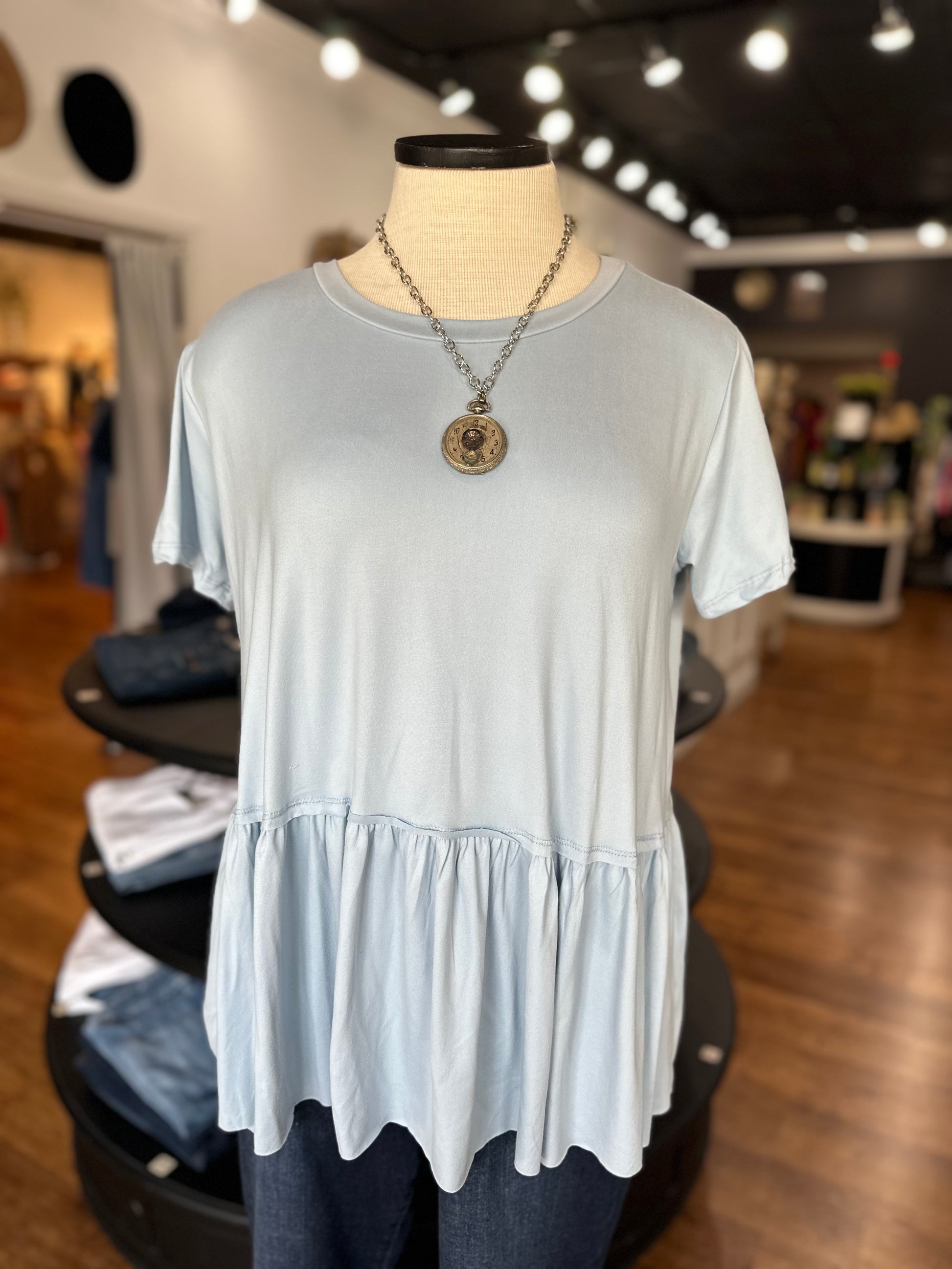 The Sweet Escape Ruffle Top features a playful round neckline and charming ruffle hemline, crafted from super soft fabric for all-day comfort. Perfect for adding a flirty touch to your casual look!