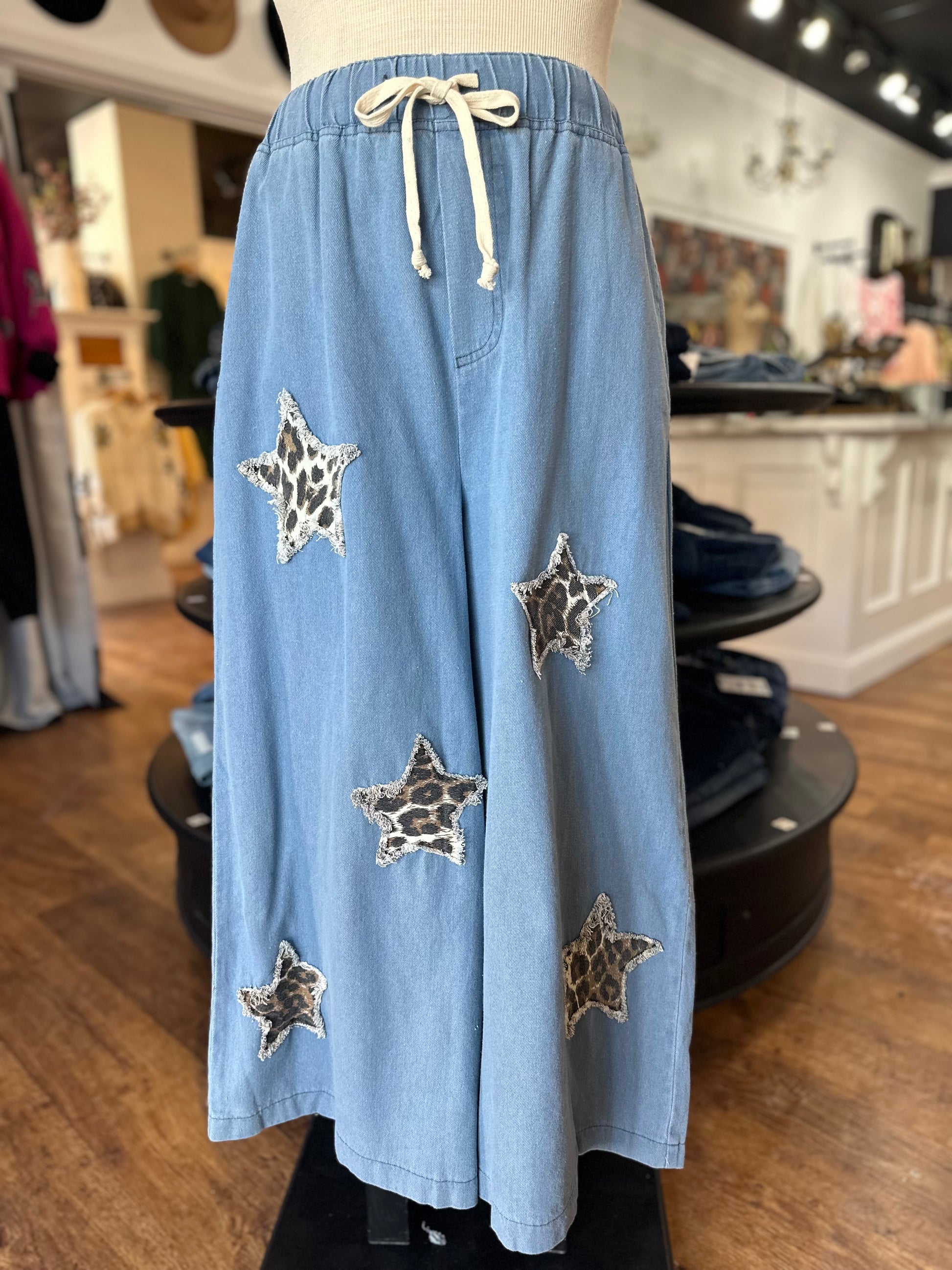 Embrace your wild side with our Urban Glam Wide Leg Pants. These eye-catching pants feature an elastic waist for ultimate comfort, while bold animal print star accents add a touch of sass. Feel fierce and fabulous in these trendy, yet comfortable wide leg pants.