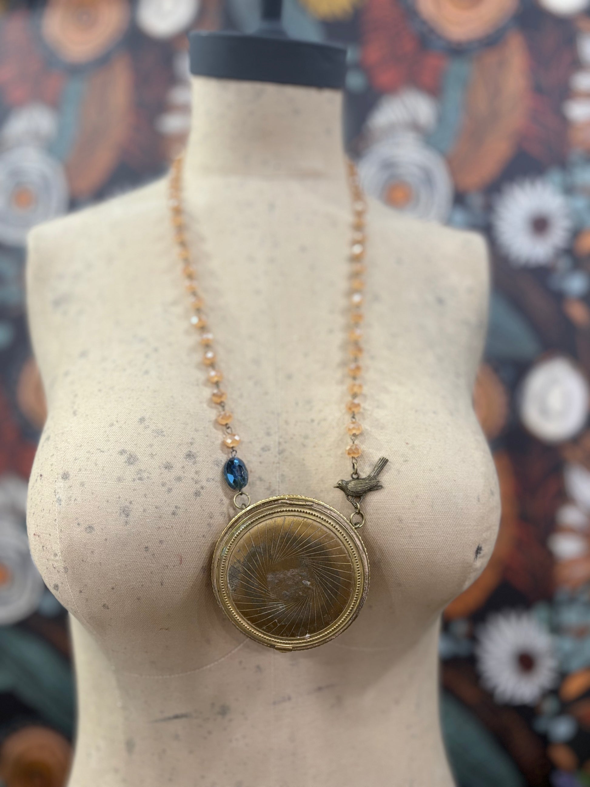 Vintage piece is attached to a faceted champagne beaded necklace and is adorned with an antiqued brass bird charm and a blue faceted bead accent.