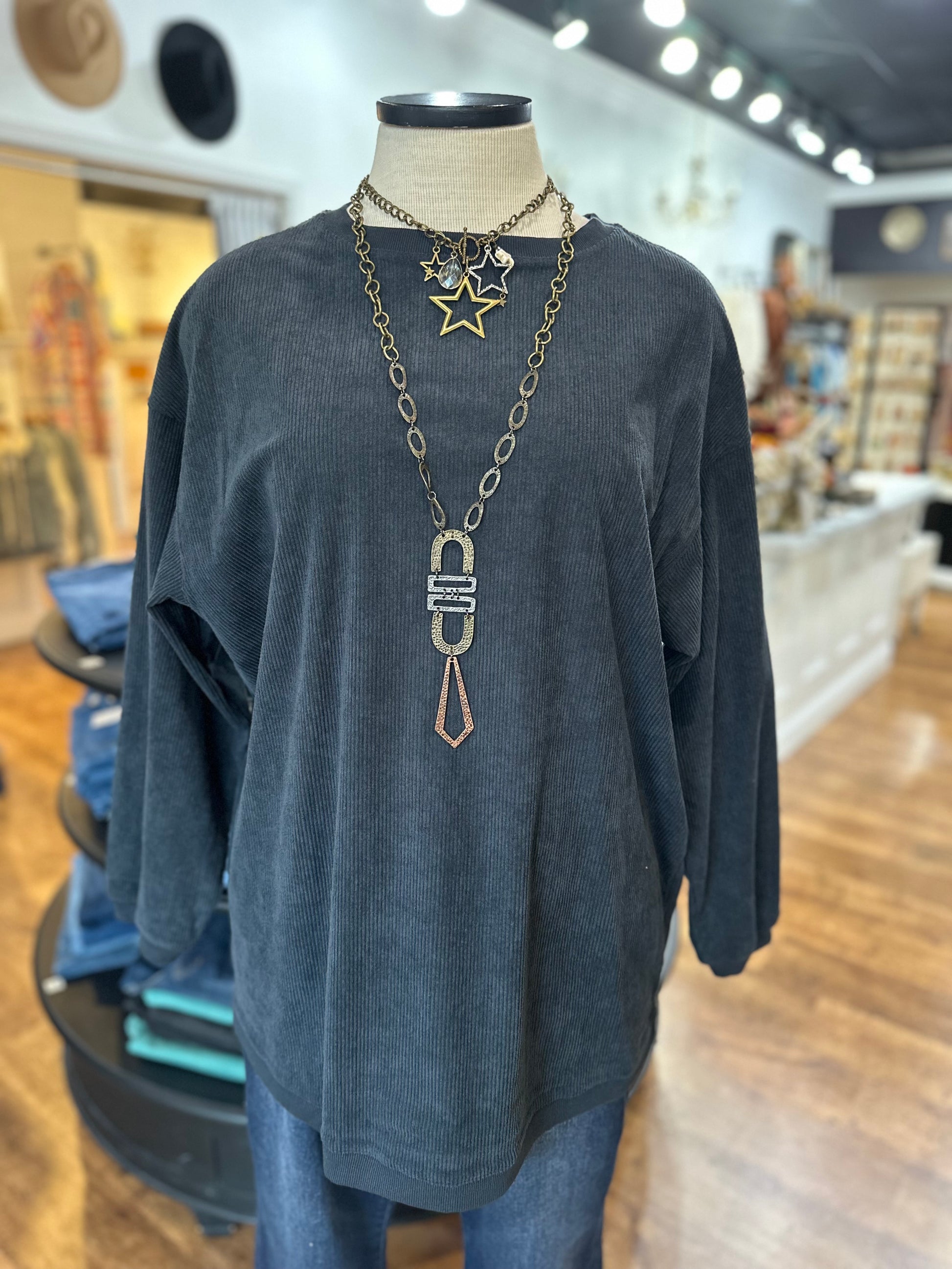 Stay cozy and chic in the Walked With You Corduroy Sweatshirt. Made from soft, ribbed corduroy, this oversized piece features long sleeves with dropped shoulders for a relaxed vibe. The ribbed neckline, cuffs, and hemline add subtle texture while keeping the comfy fit in place. Perfect for leisurely days or layering up with style.