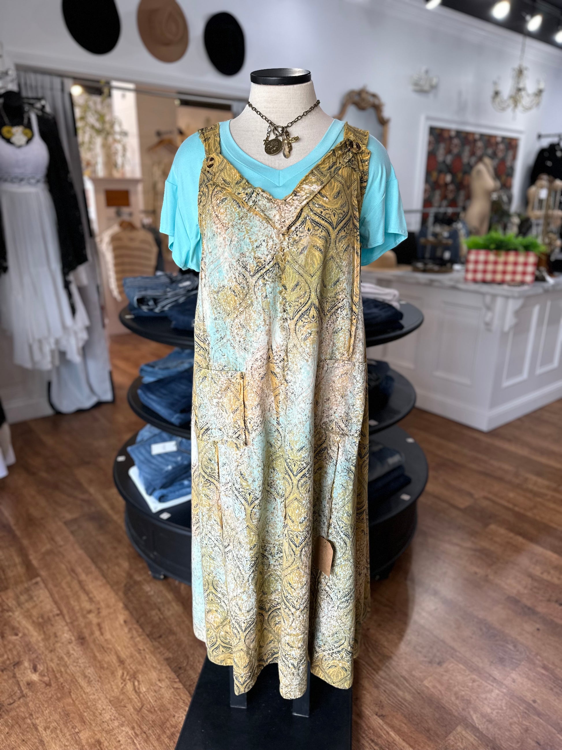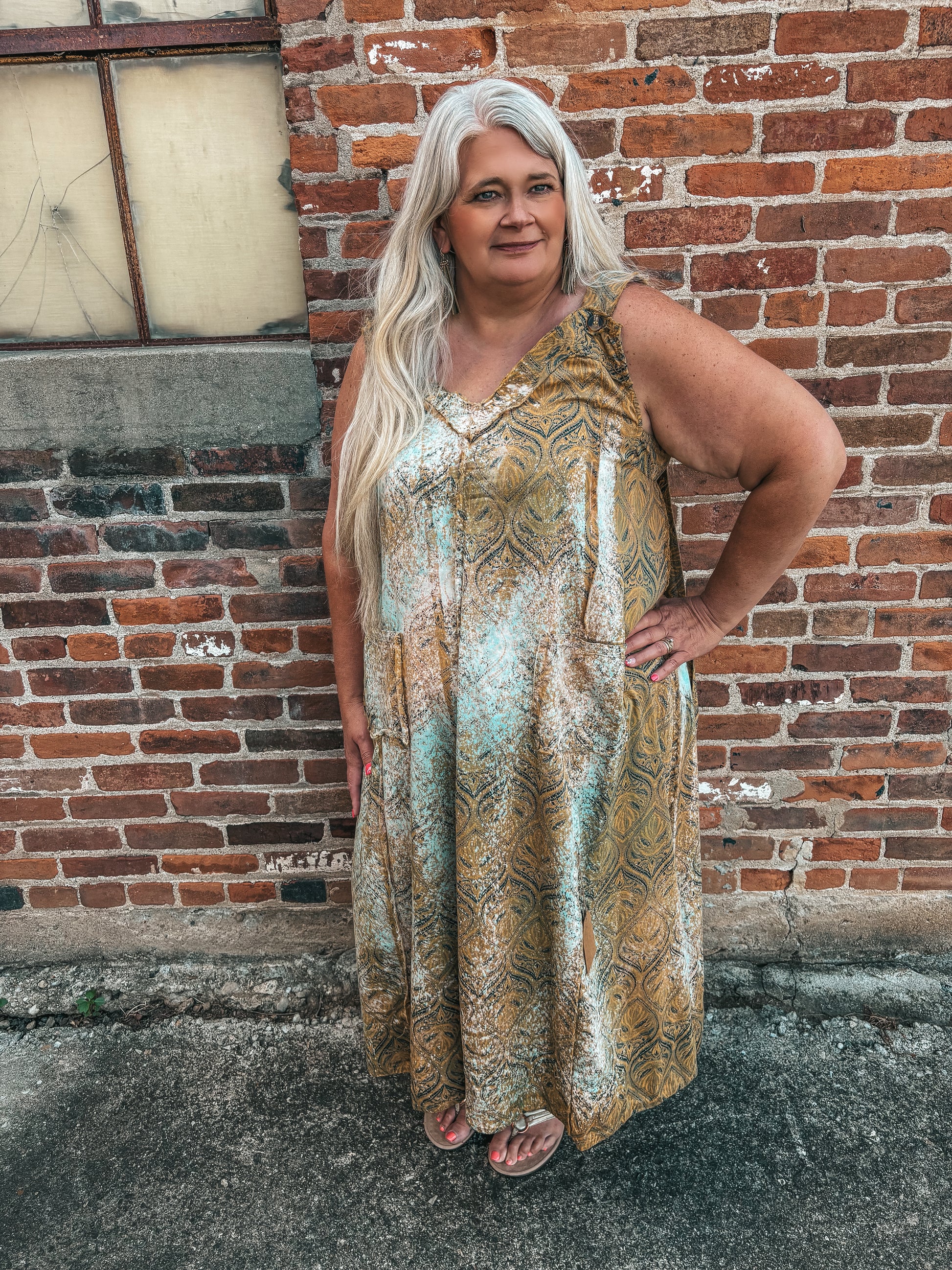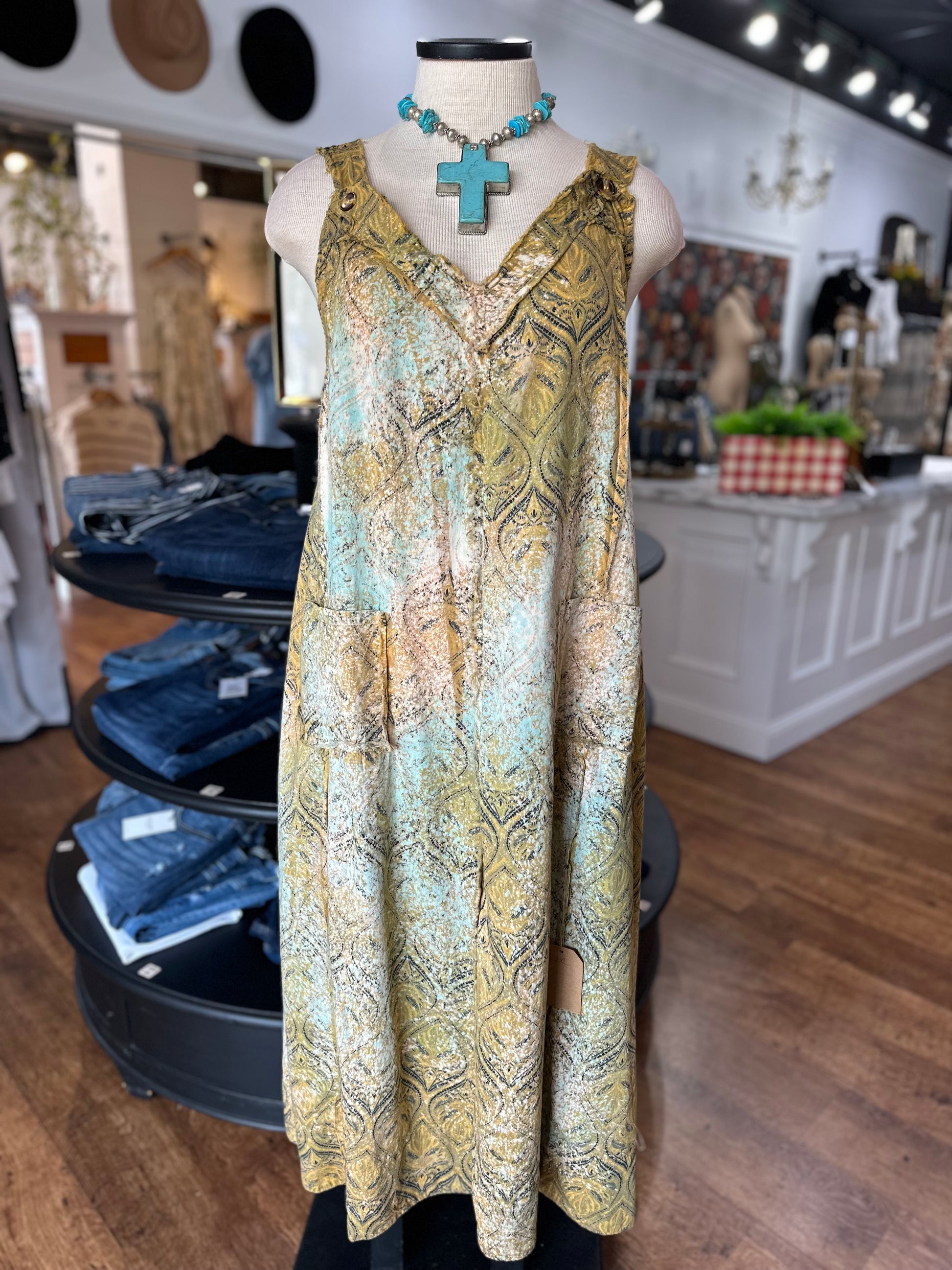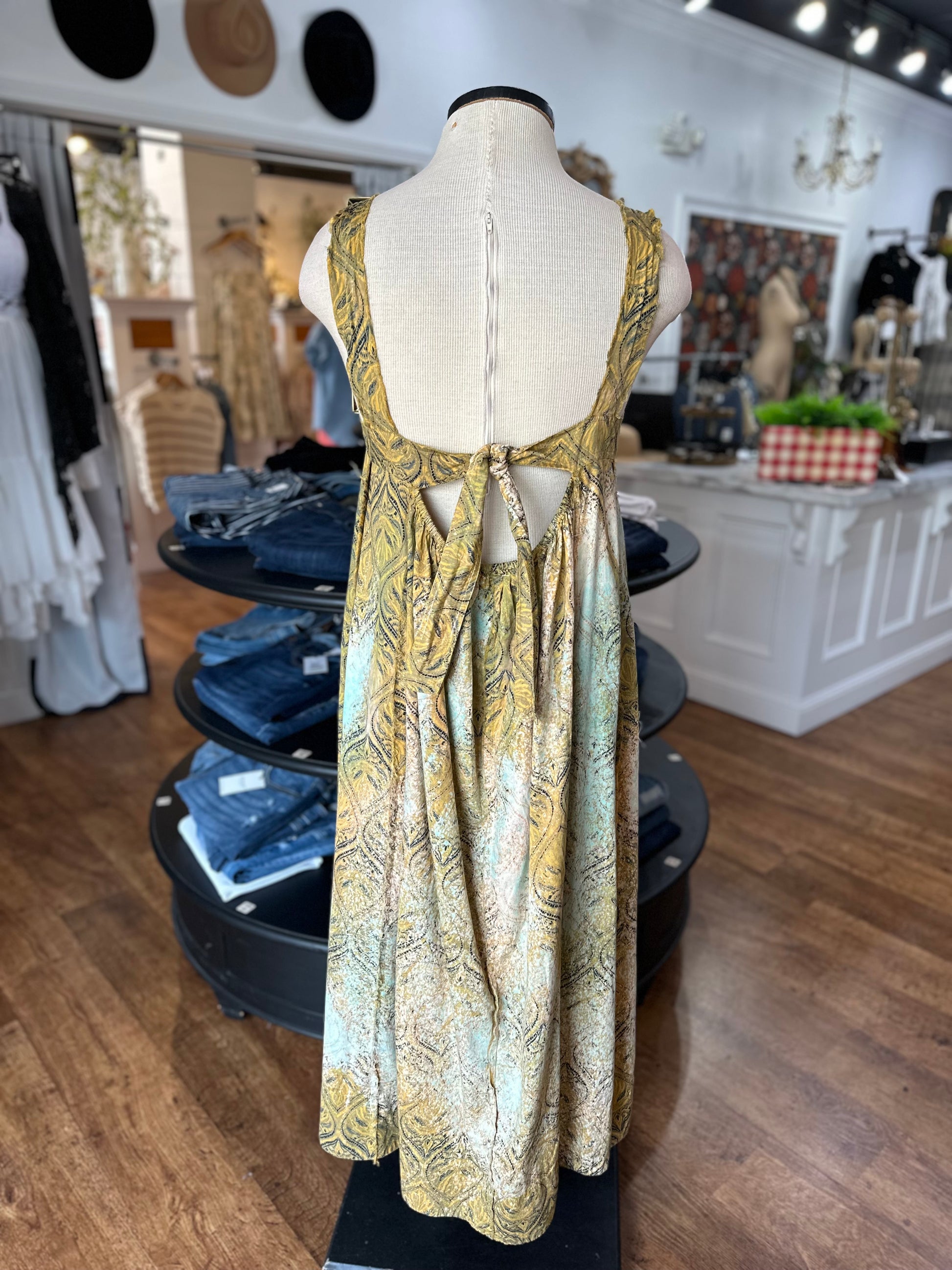 Embrace effortless style with the Woodstock Adjustable Dress, featuring a vibrant mustard distressed paisley print that adds a touch of boho charm. Adjustable straps and an elastic back with a playful tie ensure a perfect, comfy fit all day long. Its flowing long length makes it ideal for sunny days or casual evenings, bringing a carefree vibe to your wardrobe.